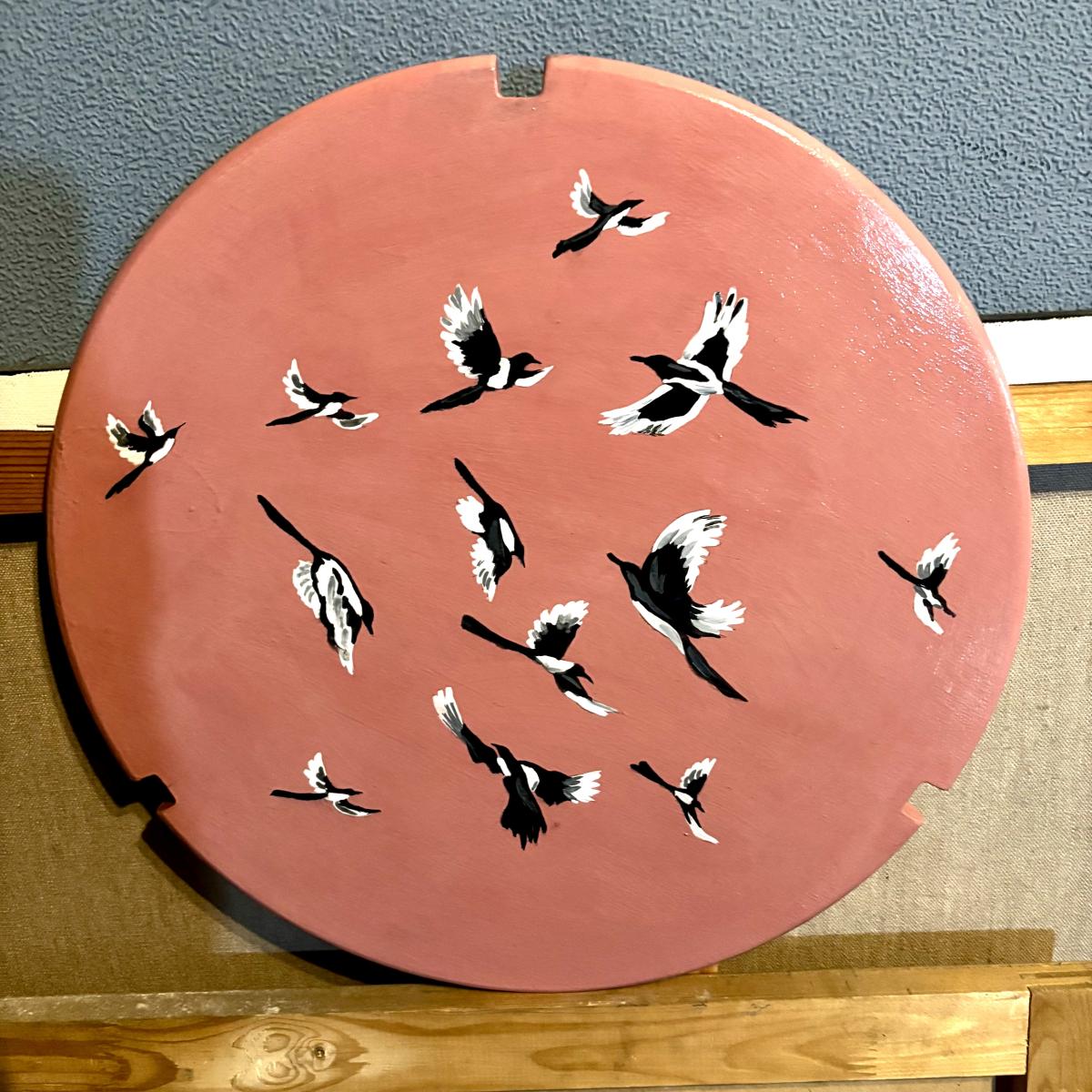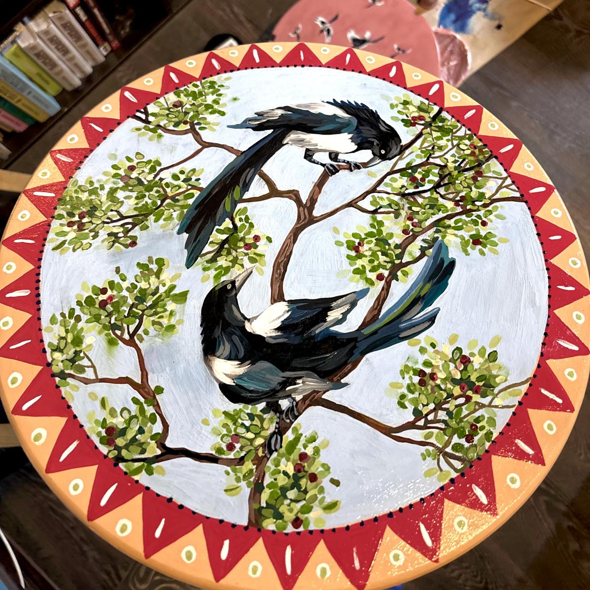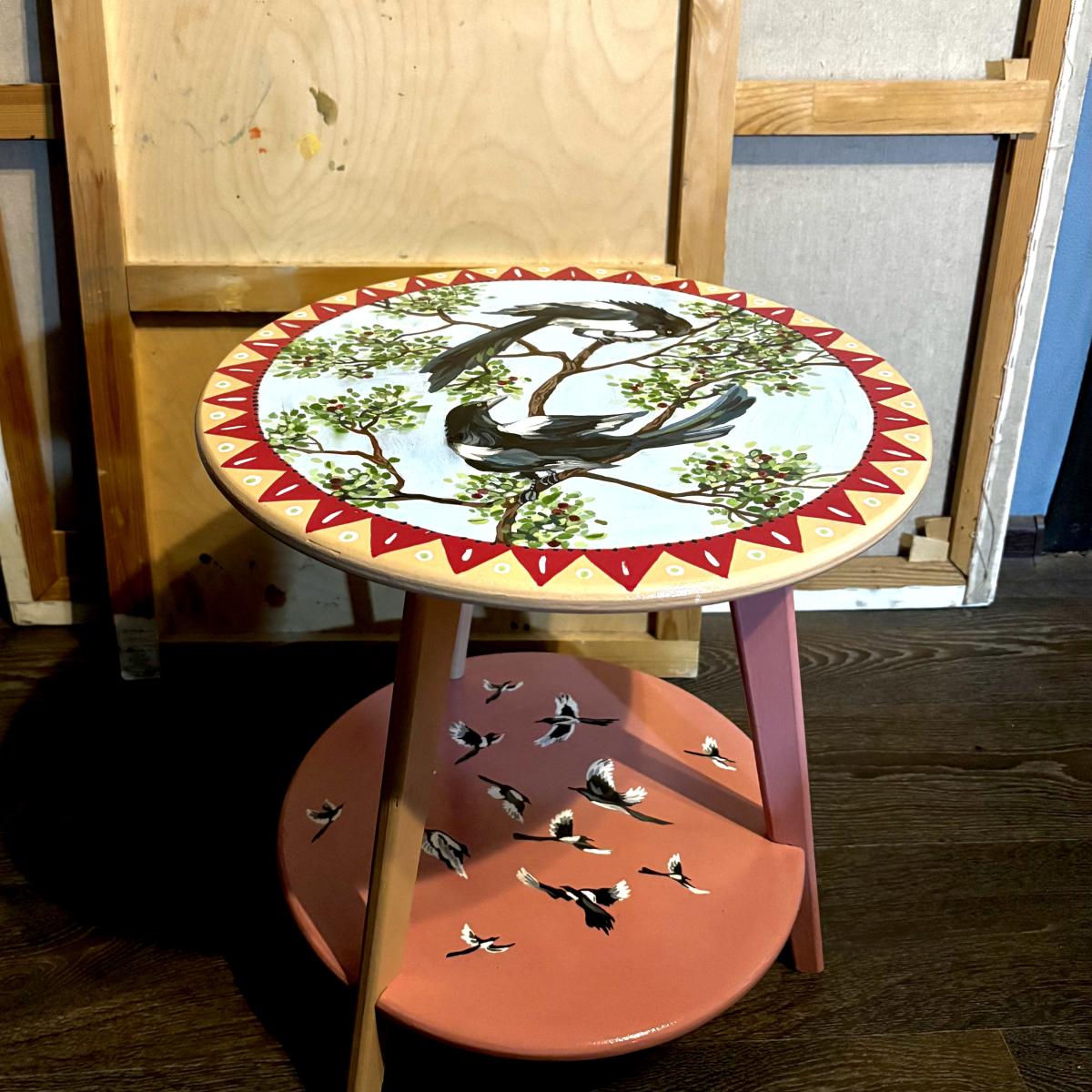 стол круглый журнальный, ручная роспись, стол покрыт лаком, легко собирается и разбирается, диаметр столешницы 40 см, высота стола 45 см