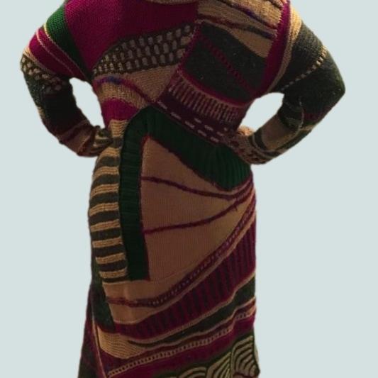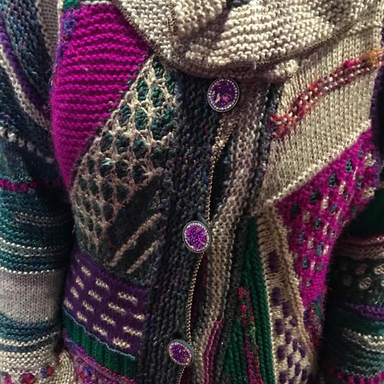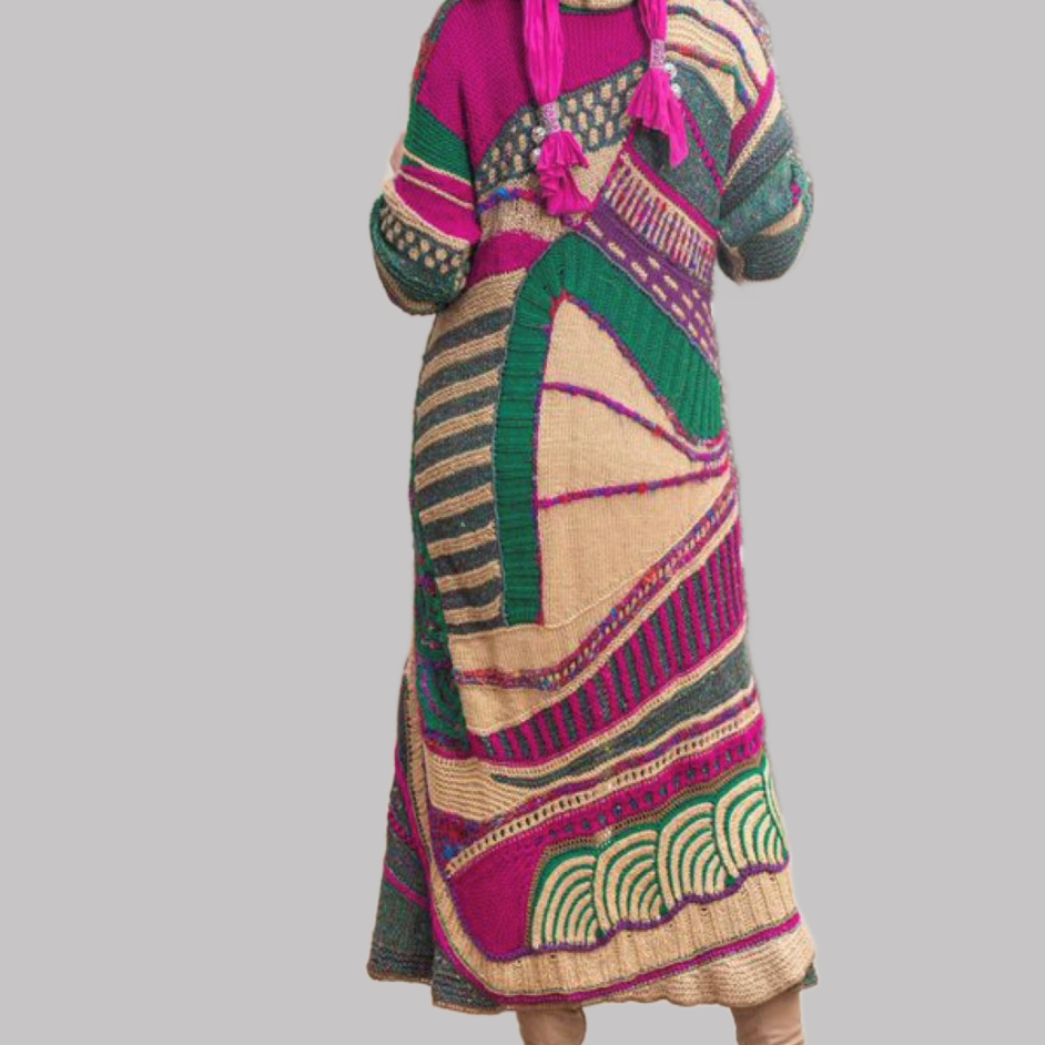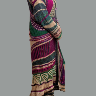 Яркое и сочное, немного разухабистое, абсолютно неповторимое пальто, удлиненный жакет или вязаный кардиган. Назвать эту вещицу можно по-разному, неизменным останется ее броскость и неповторимость, причудливость цветовой комбинации и непонятность рисунка. Нечто среднее между наскальной живописью и орнаментами майи. Мимо точно не пройдешь! Требует от Обладательницы определенной свободы взглядов и независимости от мнения большинства. Выполнено в манере мнимой неряшливости. Если Вы любите неординарные одежды, неизбитые дизайны, то это пальто для Вас.