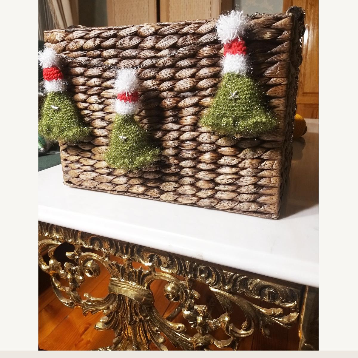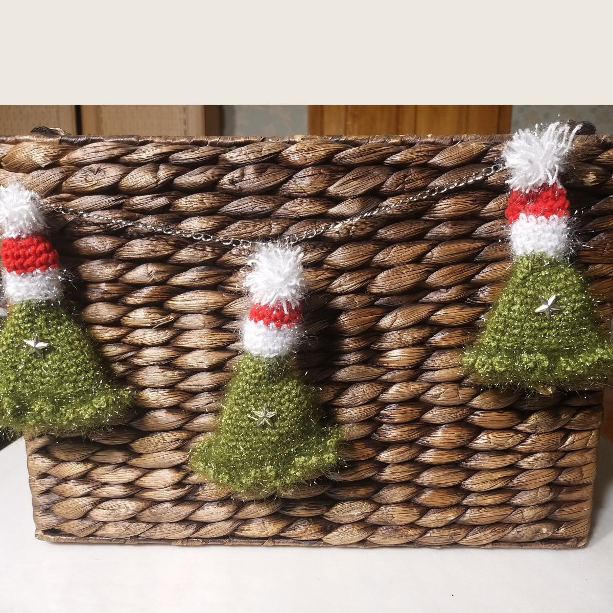 Замечательное украшение на новый год для интерьера, гирлянда из вязаных новогодних елочек, которые можно на цепочки повесить в любой угол интерьера.