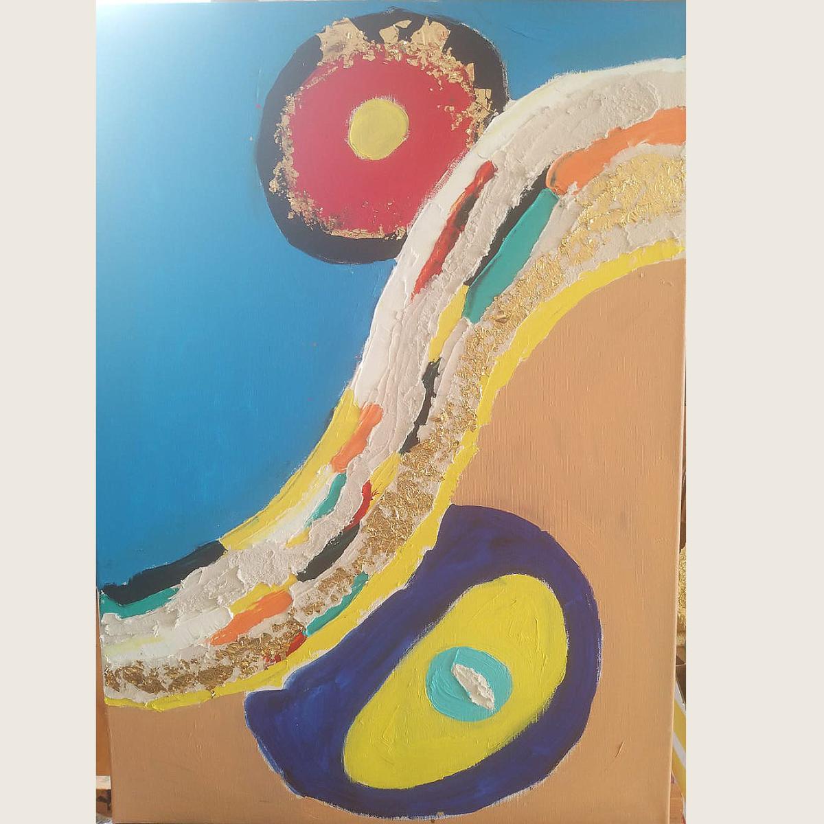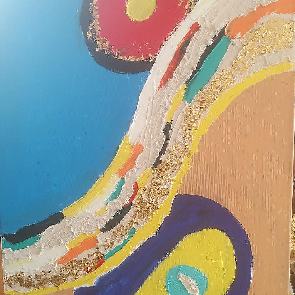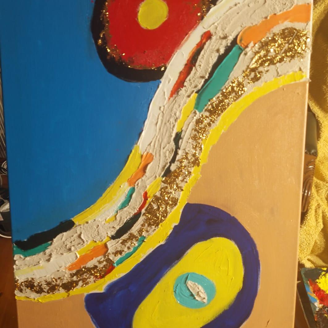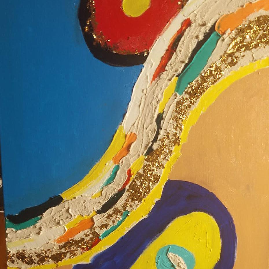 Очень интересная картина выполнена яркими красками и мастихином, добавлены фактурный песок и поталь. Интересный геометрический сюжет.