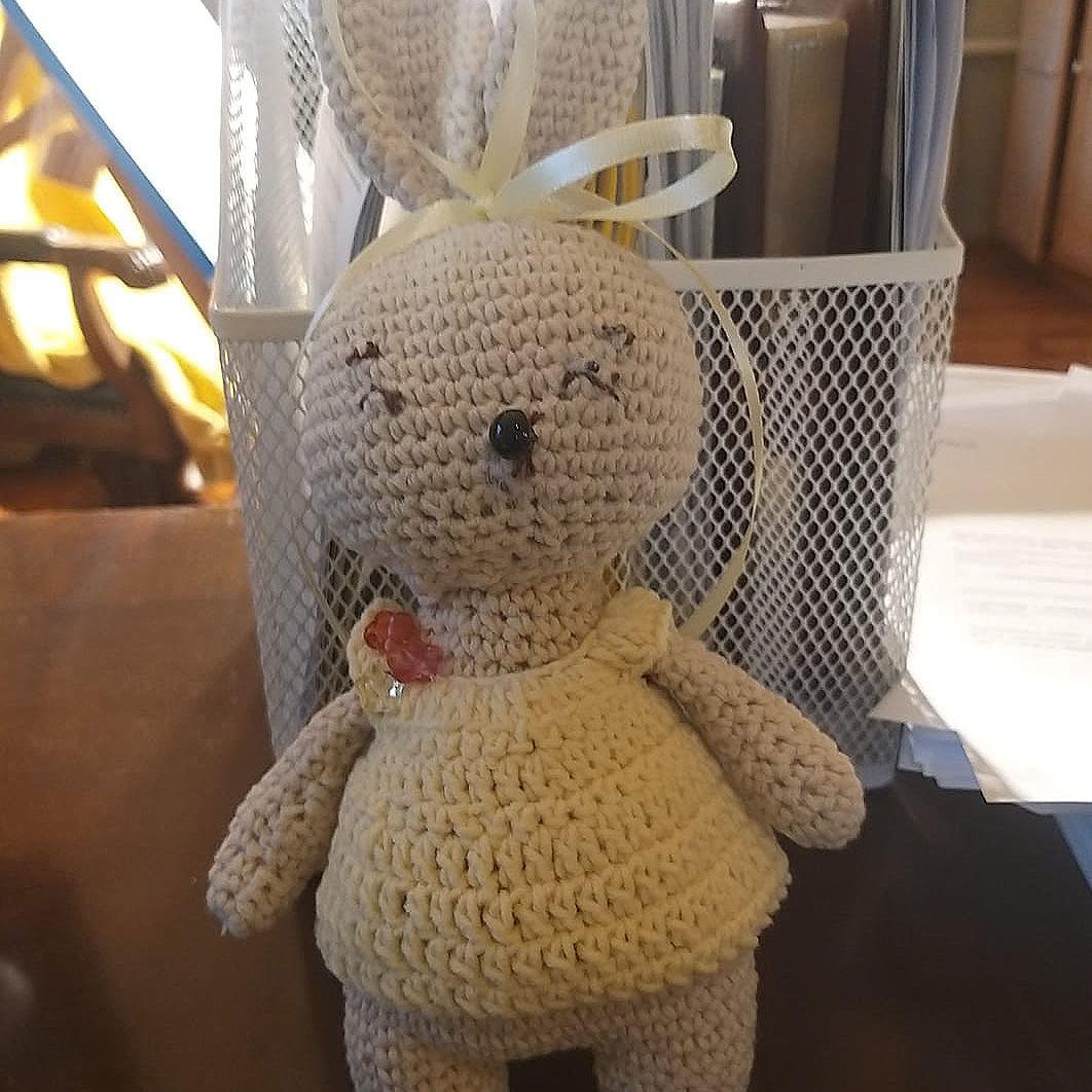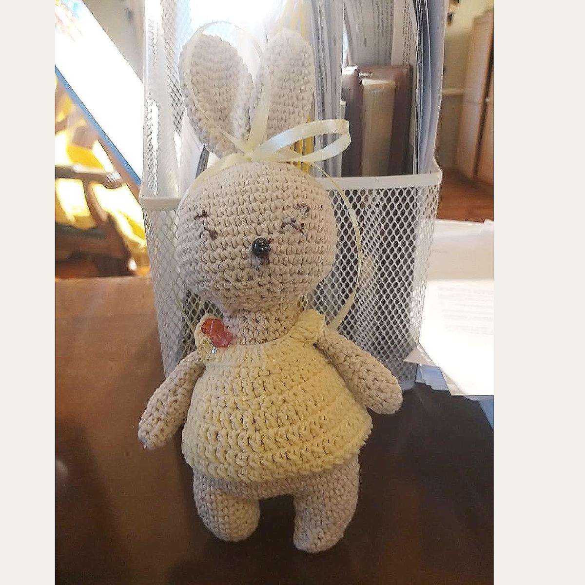 Замечательный зайчик из пряжи хлопковой и в желтом платьеце, подходит для детской игры