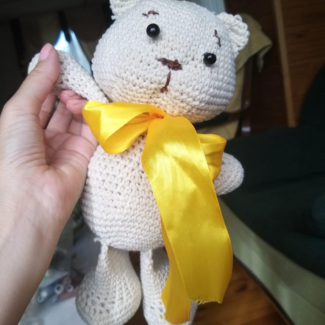 Интересная детская игрушка связанная хлопковой пряжей и украшена атласной лентой, подойдет детям любого возвраста