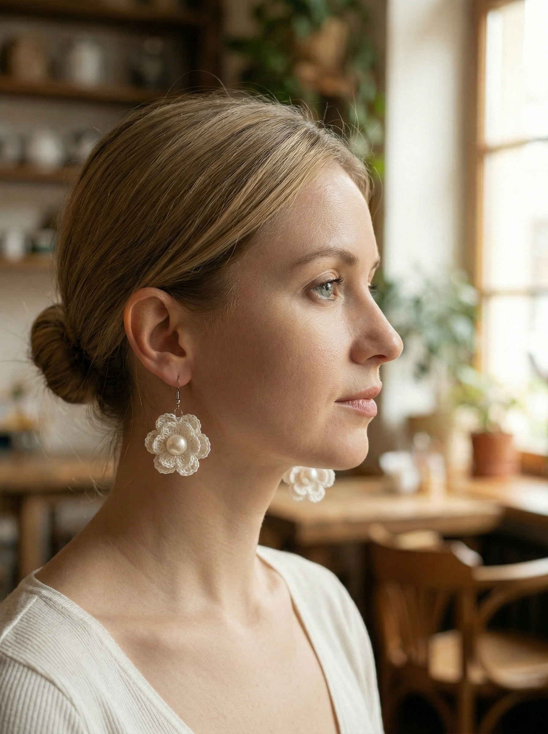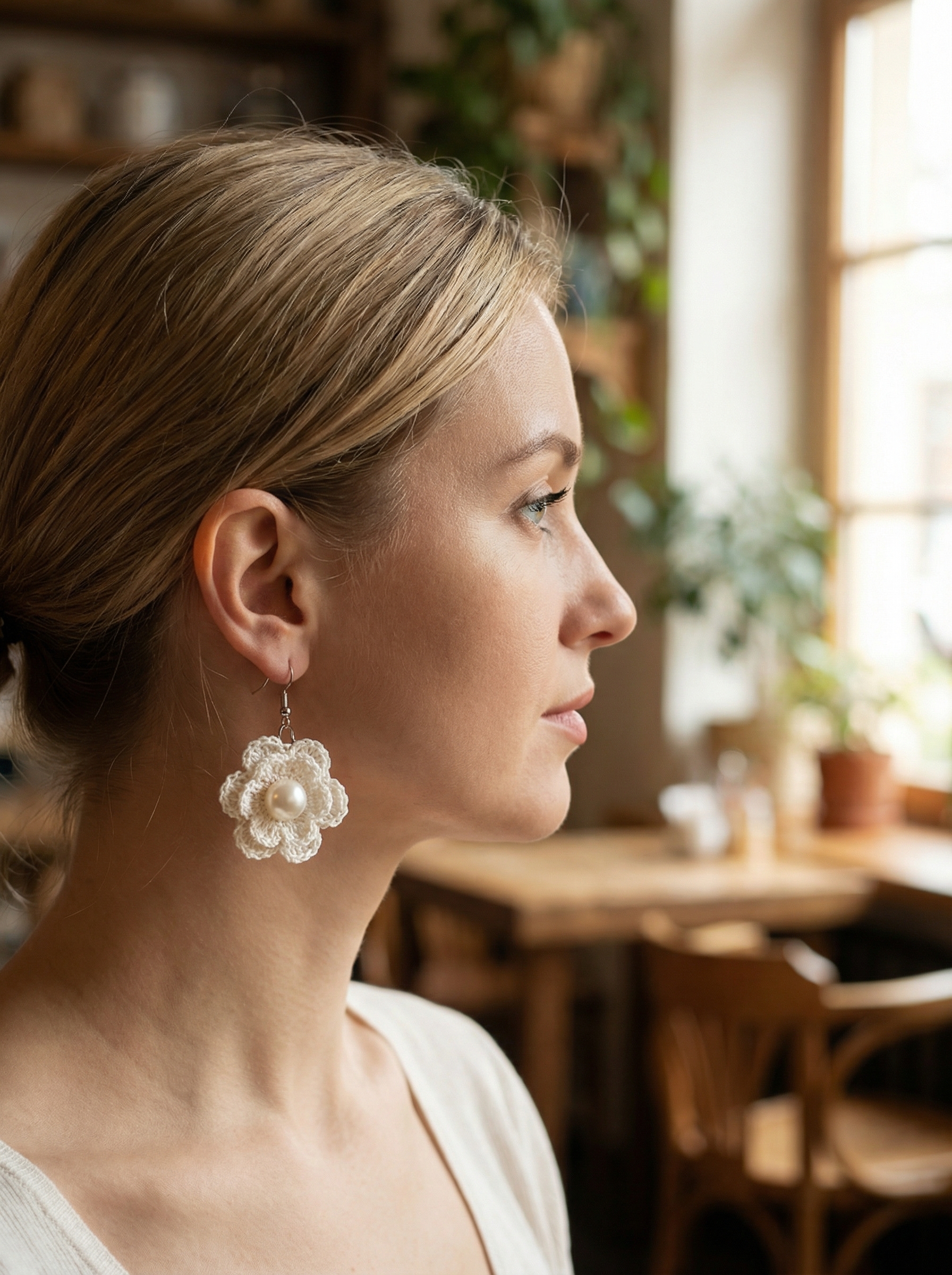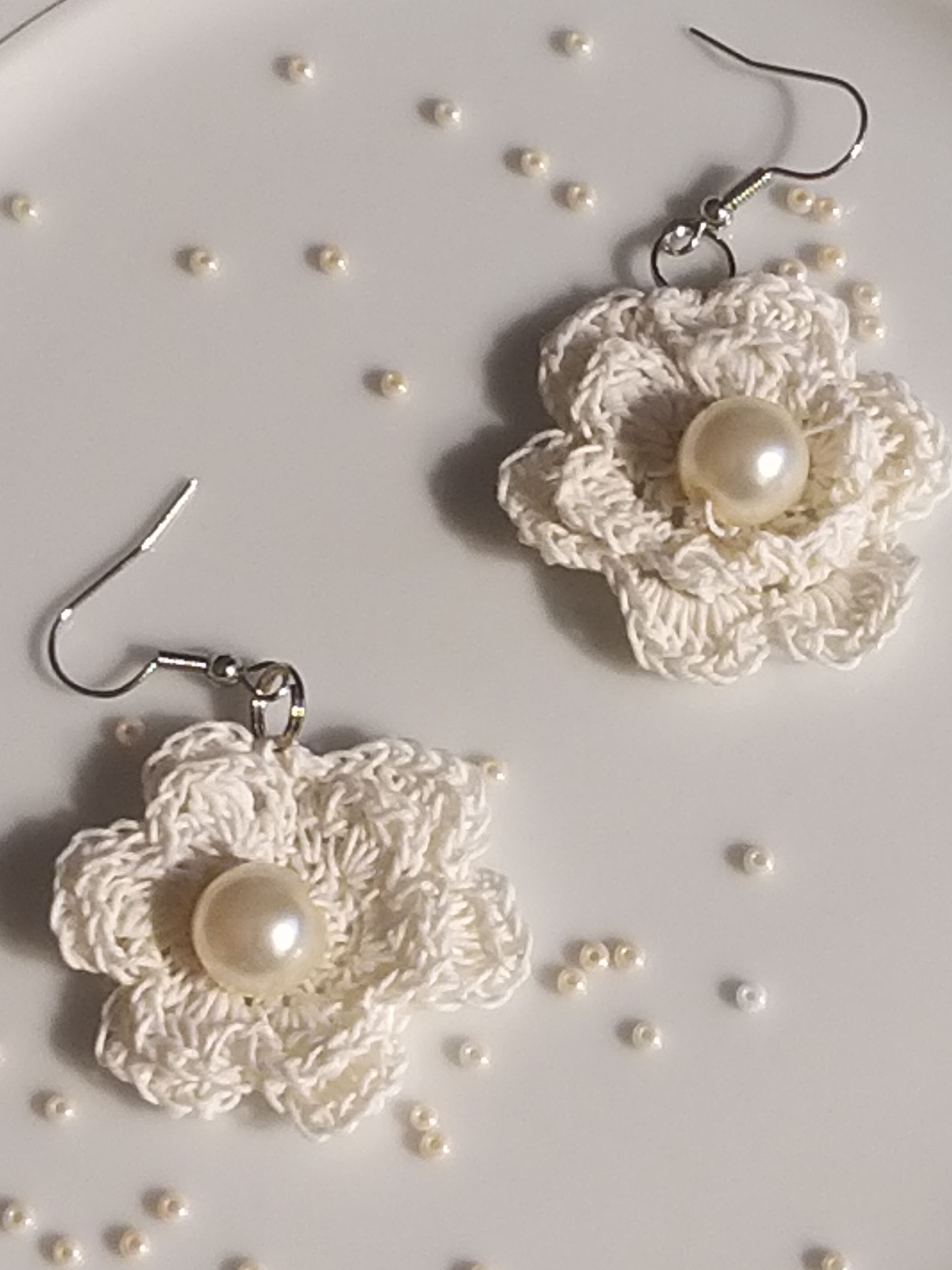 Белые сережки цветочки из тончайшей пряжи, с перламутровой бусиной.