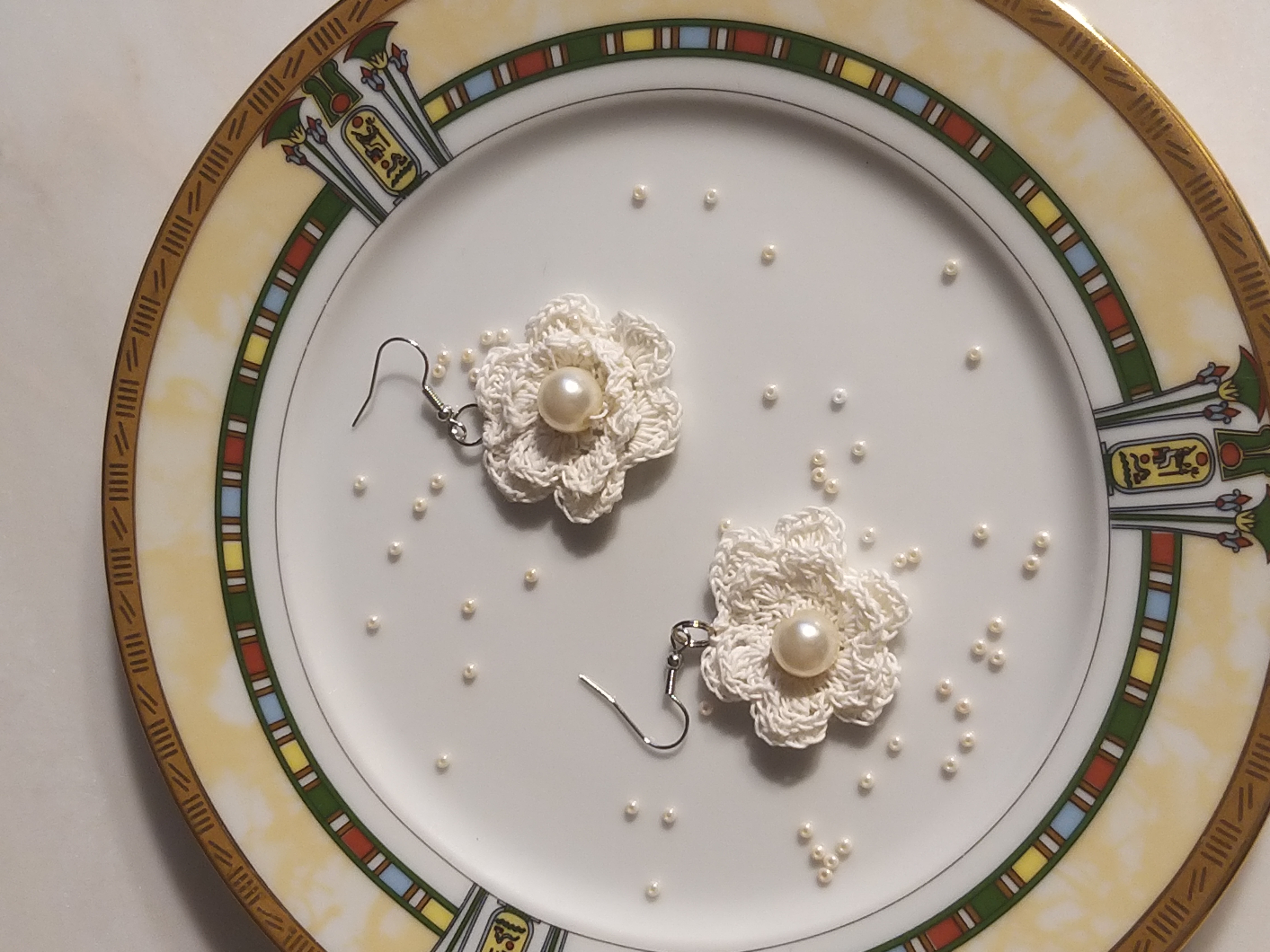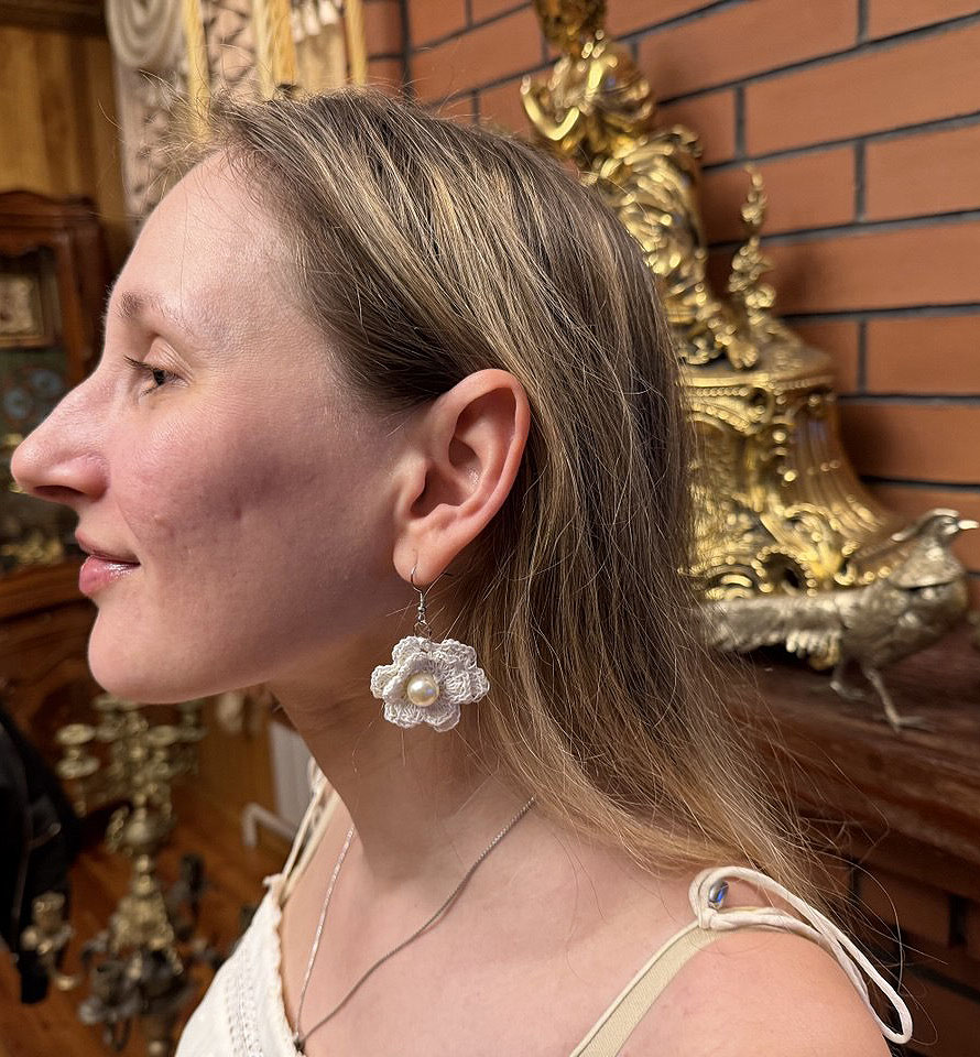Белые сережки цветочки из тончайшей пряжи, с перламутровой бусиной.