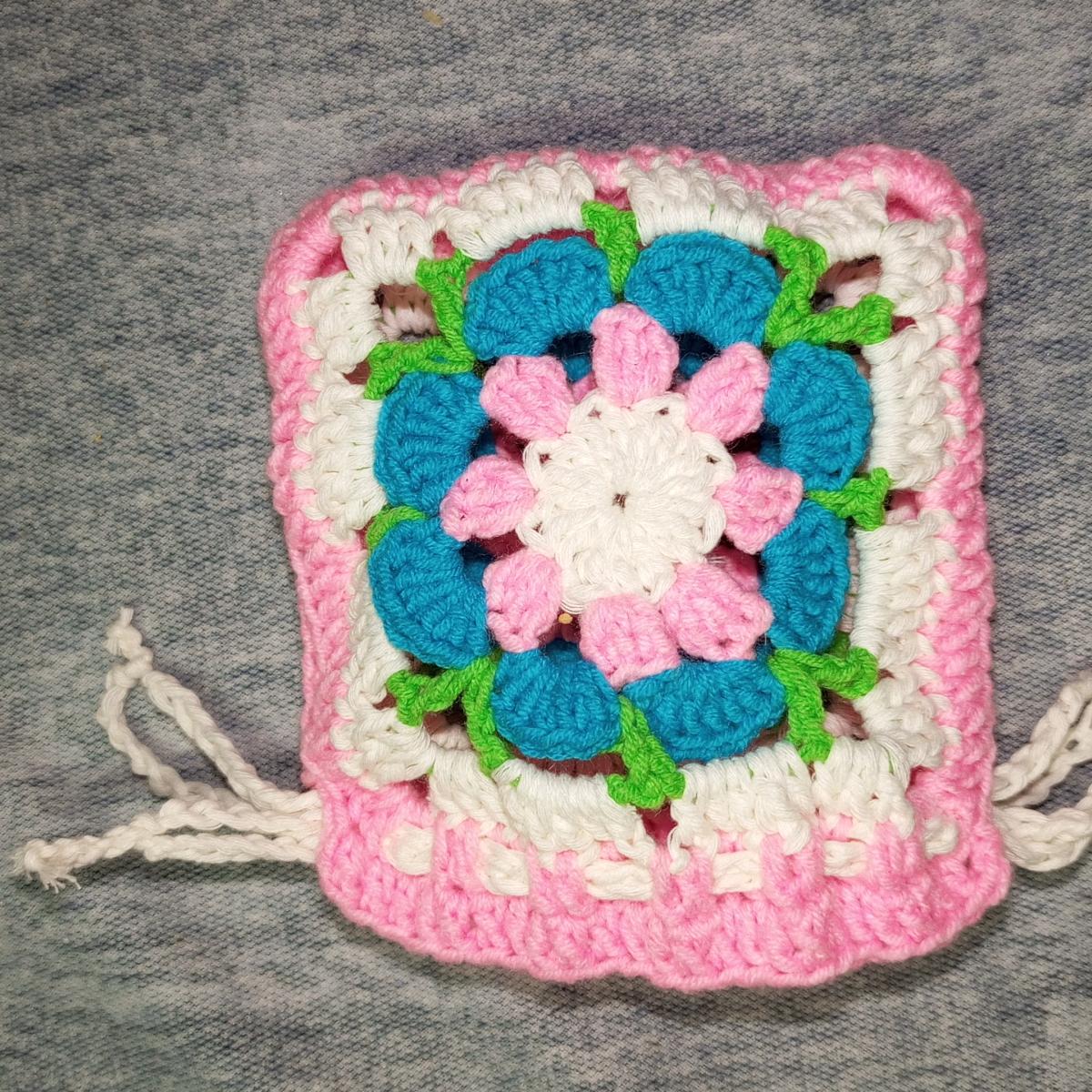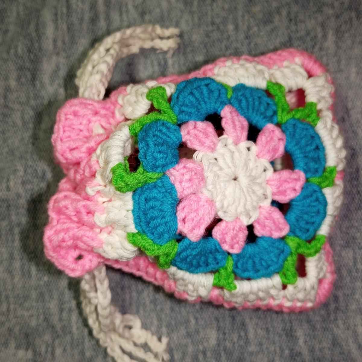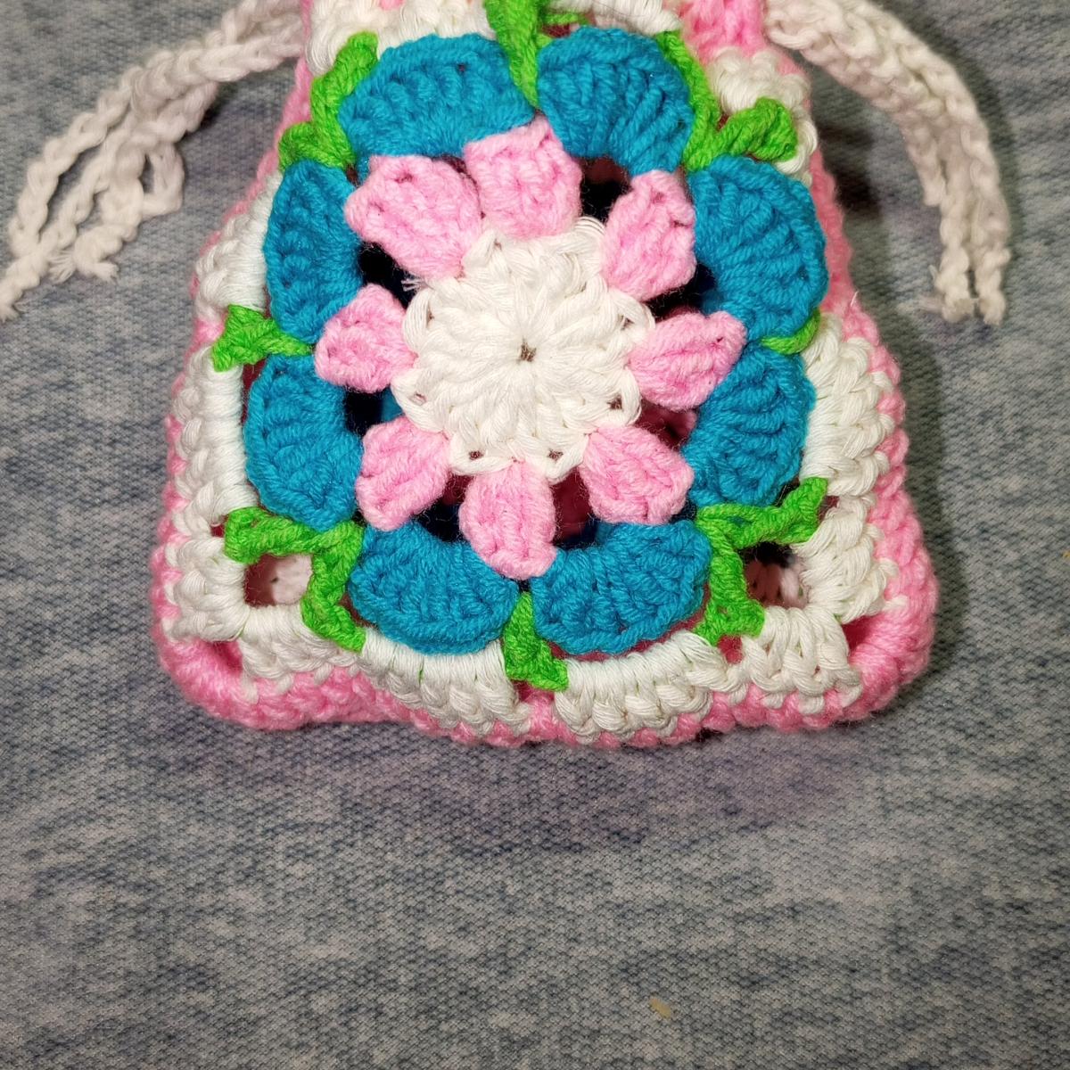 вязаный мешочек крючком своими руками из ажурных квадратиков с изображением цветка подойдёт для хранения не мелких деталей и вещей