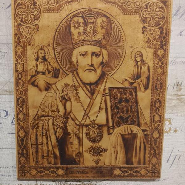 На изображении изображена икона Николай Чудотворец выполненная в традиционном стиле.Икона выполнена в теплых золотистых и коричневых оттенках, имитируя древние резные иконы или лакированные доски. Обрамление украшено сложными орнаментами и крестами в углах, что подчеркивает её святой статус и художественное мастерство. Общий стиль создаёт ощущение глубокой духовности и традиционного религиозного вдохновения.