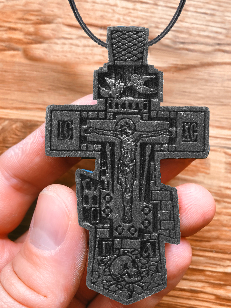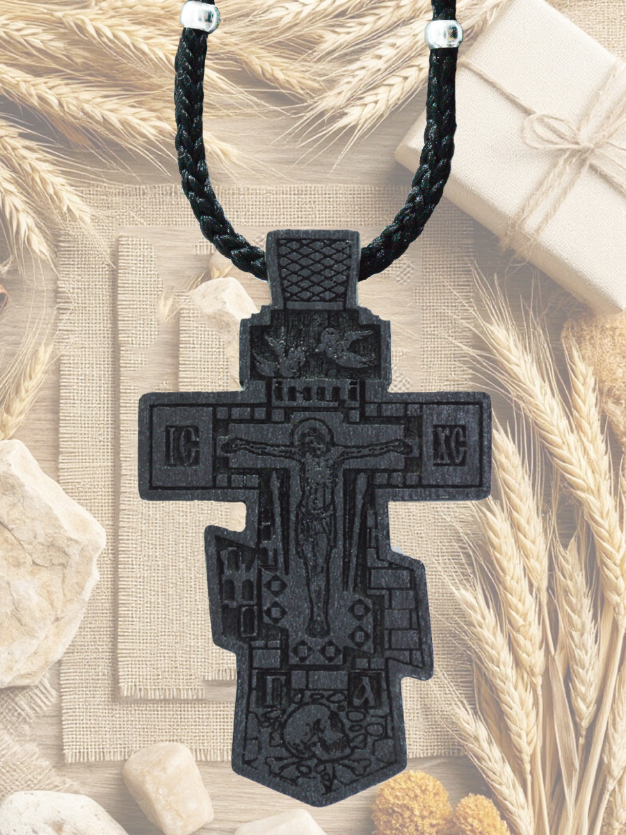 Нательный, крупный, мужской крест. В комплект входит шнур-гайтан сечением 4 миллиметра и длиной 70 сантиметров. Замок-карабин. Шнур украшен посеребренными элементами-вставками. (фото №2). Размер креста указан в карточке товара №3. Изготовленный из граба, обработанного до черного состояния, крест обладает благородным матово-глянцевым блеском и приятной текстурой. Покрытие воском придает изделию дополнительную прочность и защищает его от внешних воздействий. Крест станет прекрасным дополнением к любому образу и подчеркнет индивидуальность своего обладателя.