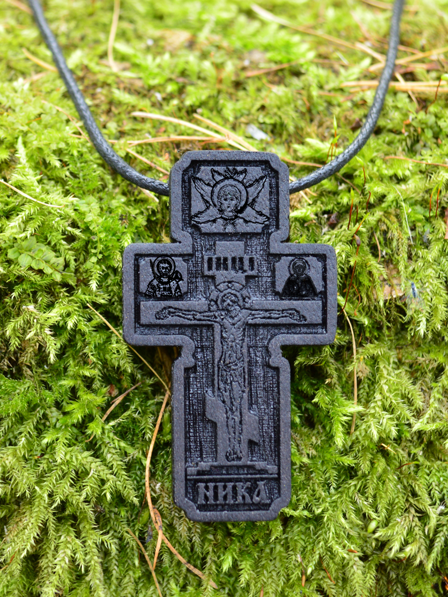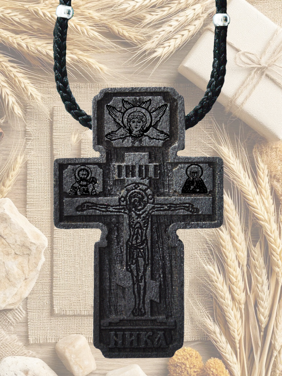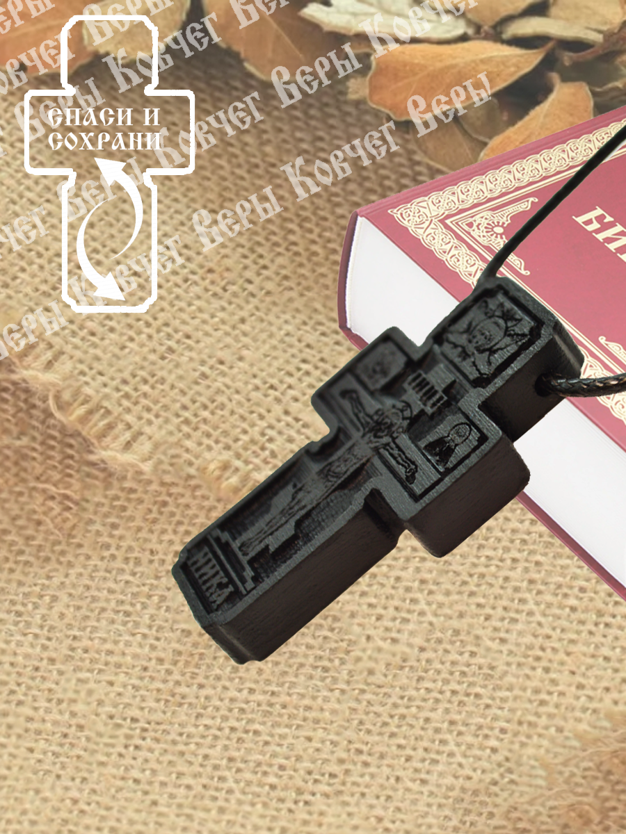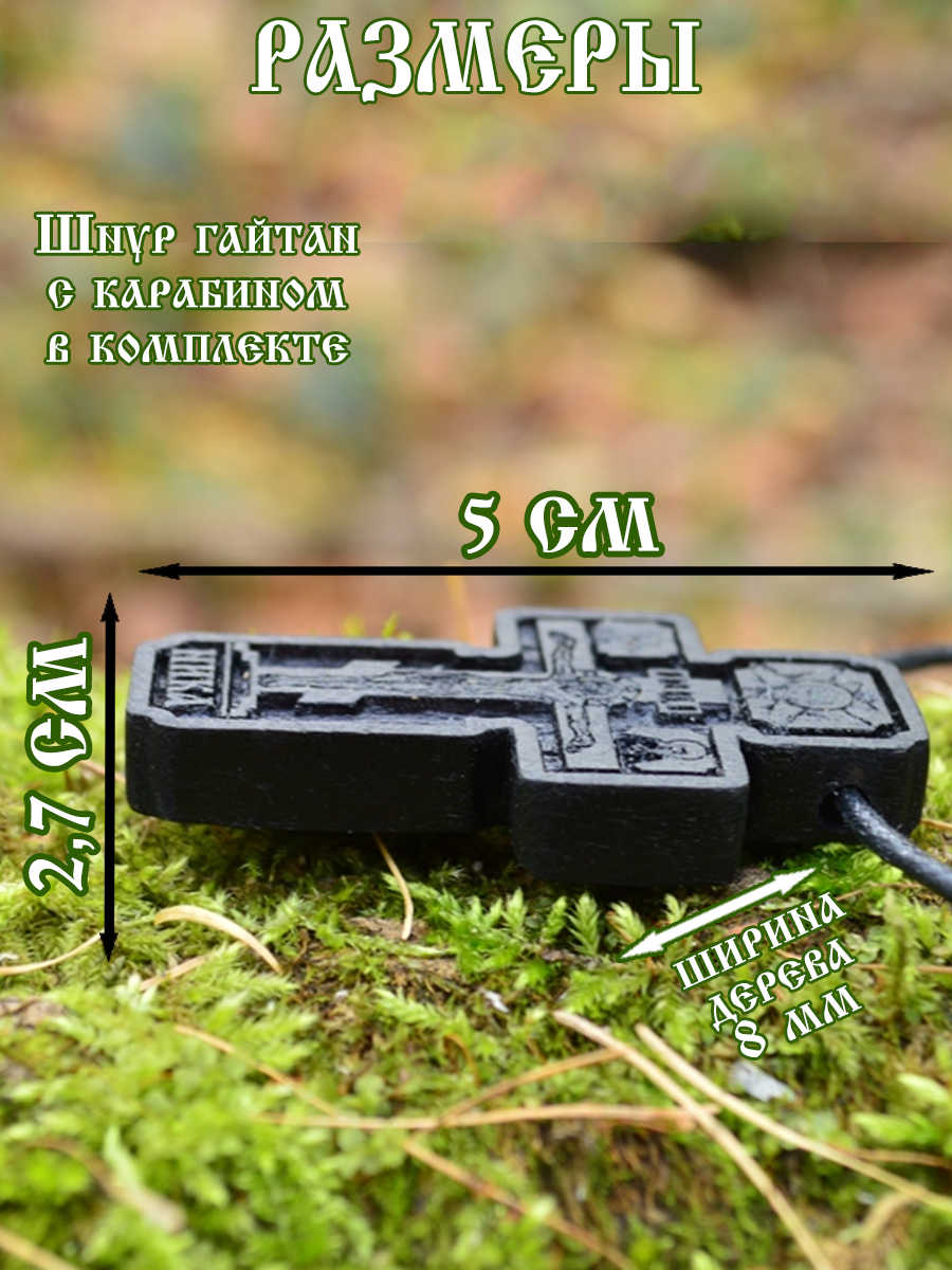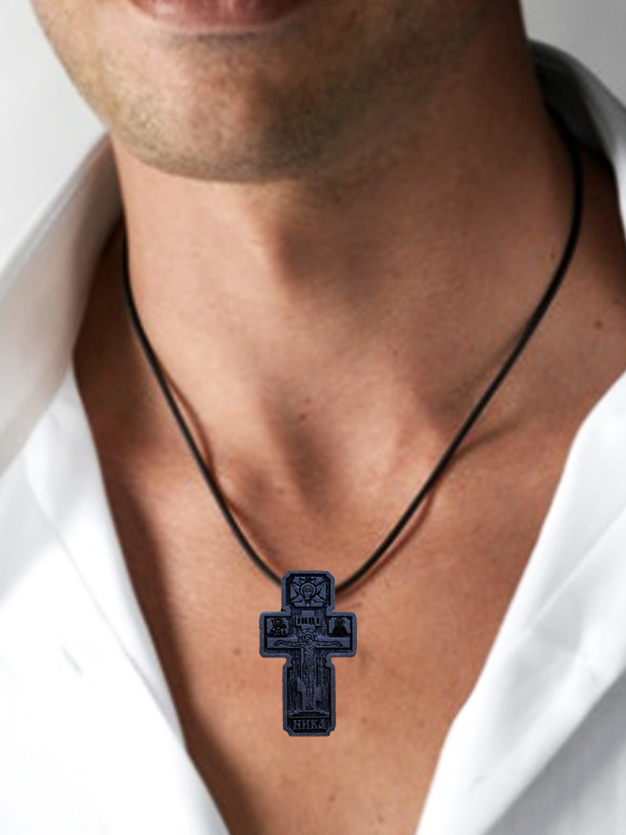 Крест – распятие, авторская работа. Ручная работа в сочетании с современными технологиями. В комплект входит шнур-гайтан сечением 4 миллиметра и длиной 70 сантиметров. Замок-карабин. Шнур украшен посеребренными элементами-вставками. (фото №2). Размер креста указан в карточке товара №3. Достаточно крупный мужской крест. Нательный православный крест покрыт комплексом масел, восков для полимеризации дерева (защиты от влаги и укрепления).
