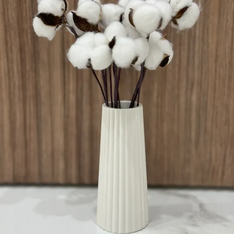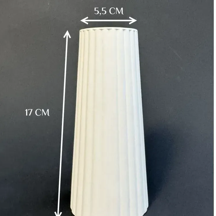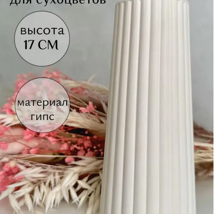 Ваза для сухоцветов, это не просто вазочка под цветы ,это великолепная большая белая ваза для сухоцветов. Изготовлена из высокопрочного гипса, который является экологически безопасным материалом . Форма вазы конусообразная, ребристая рельефная поверхность ,стиль - классический . Размер настольной вазы 17см. Дно круглое, гладкое, не царапает поверхность мебели .