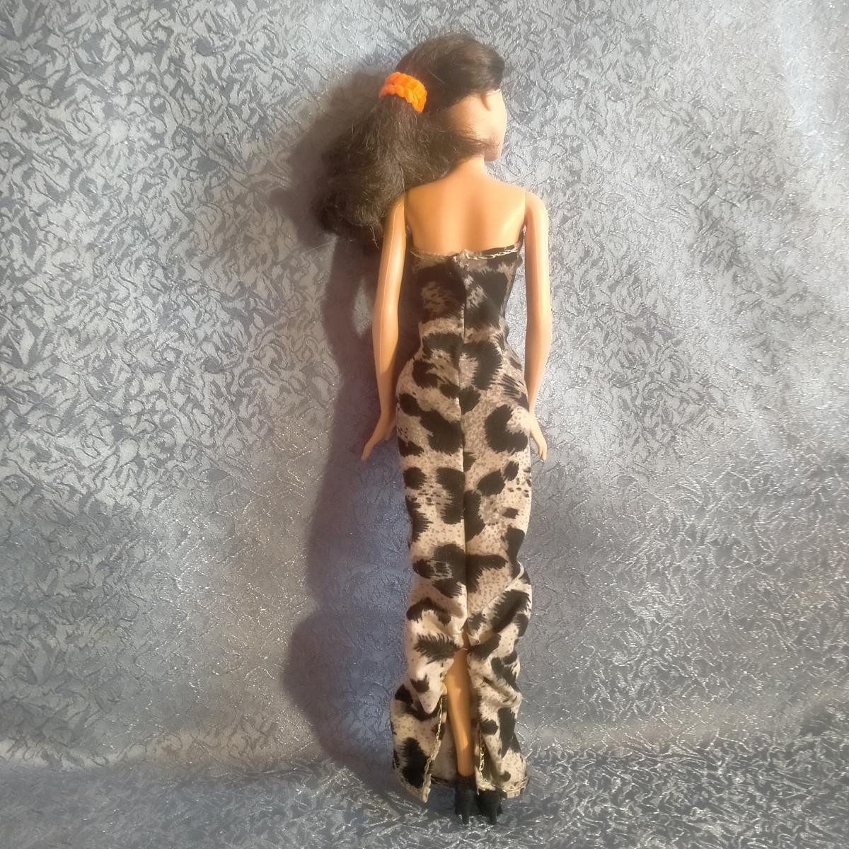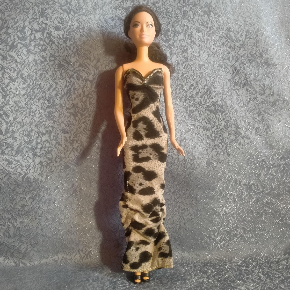 Платье для куклы Барби. Из тонкого серого трикотажа с драпировкой по подолу. Застегивается на кнопки (пришивные). Для игры детям любого возраста (делям, которые могут отгрызть мелкие детали не рекомендую). Можно стирать, приклеенных деталей нет.