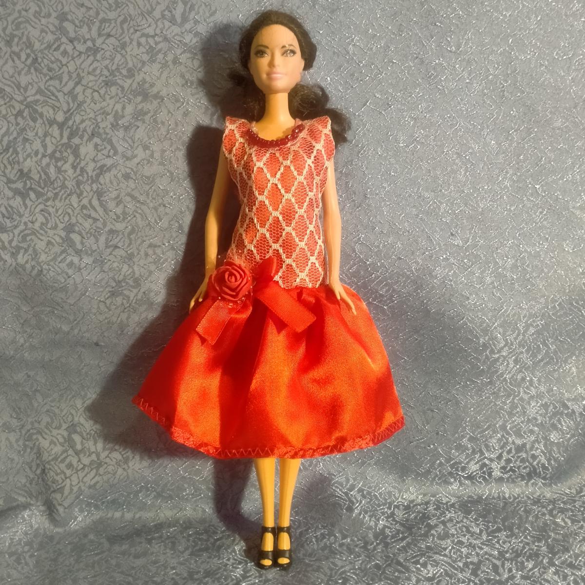 Платье для куклы Барби. Лиф красный шелк с белым гипюром, украшено бусами и цветком. Застегивается на кнопки (пришивные). Для игры детям любого возраста (делям, которые могут отгрызть мелкие детали не рекомендую). В комплекте сумочка. Платье сшито достаточно свободно - подойдет для любой Барби. Все швы обработаны на оверлоке. Можно стирать, приклеенных деталей нет. Сделано в 1 экземпляре.