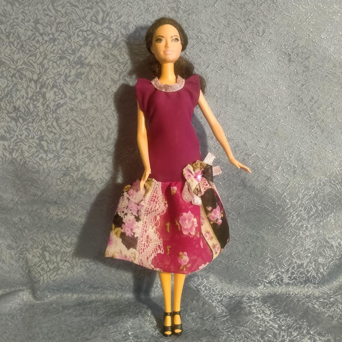 Платье для куклы Барби. Изящное, облегающее платье с летящим подолом, украшенное цветком. Застегивается на кнопки (пришивные). Все швы обработаны на оверлоке. Можно стирать, приклеенных деталей нет. Сделано в 1 экземпляре.