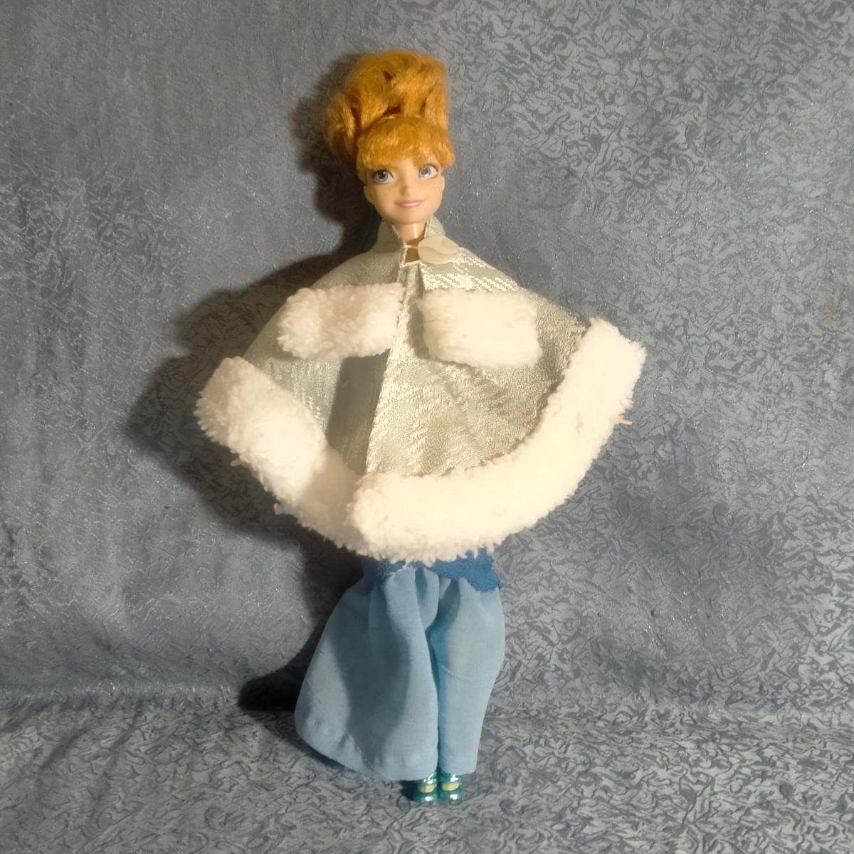 Пончо с шарфом для куклы Анны из мультфильма "Холодное сердце". Сшито из качественной ткани, отделка искусственный белый мех, на подкладке. Застегивается на кнопки (пришивные). Для игры детям любого возраста, мелких деталей, кроме пуговицы на шарфе нет. Сделано в различной цветовой гамме, заходите в магазин! Для Эльзы и Барби коротковаты рукава.