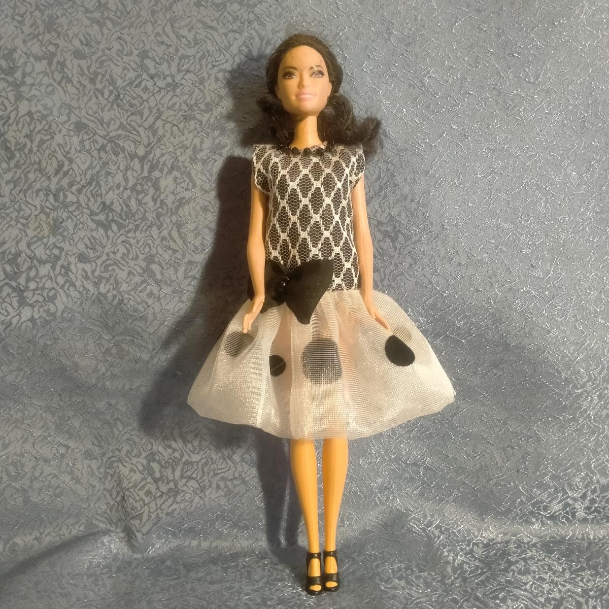 Платье для куклы Барби. Лиф черный шелк с белым гипюром, подол из органзы, украшено бусами и бантом. Застегивается на кнопки (пришивные). Для игры детям любого возраста (делям, которые могут отгрызть мелкие детали не рекомендую). В комплекте сумочка. Платье сшито достаточно свободно - подойдет для любой Барби. Все швы обработаны на оверлоке. Можно стирать, приклеенных деталей нет. Сделано в 1 экземпляре.
