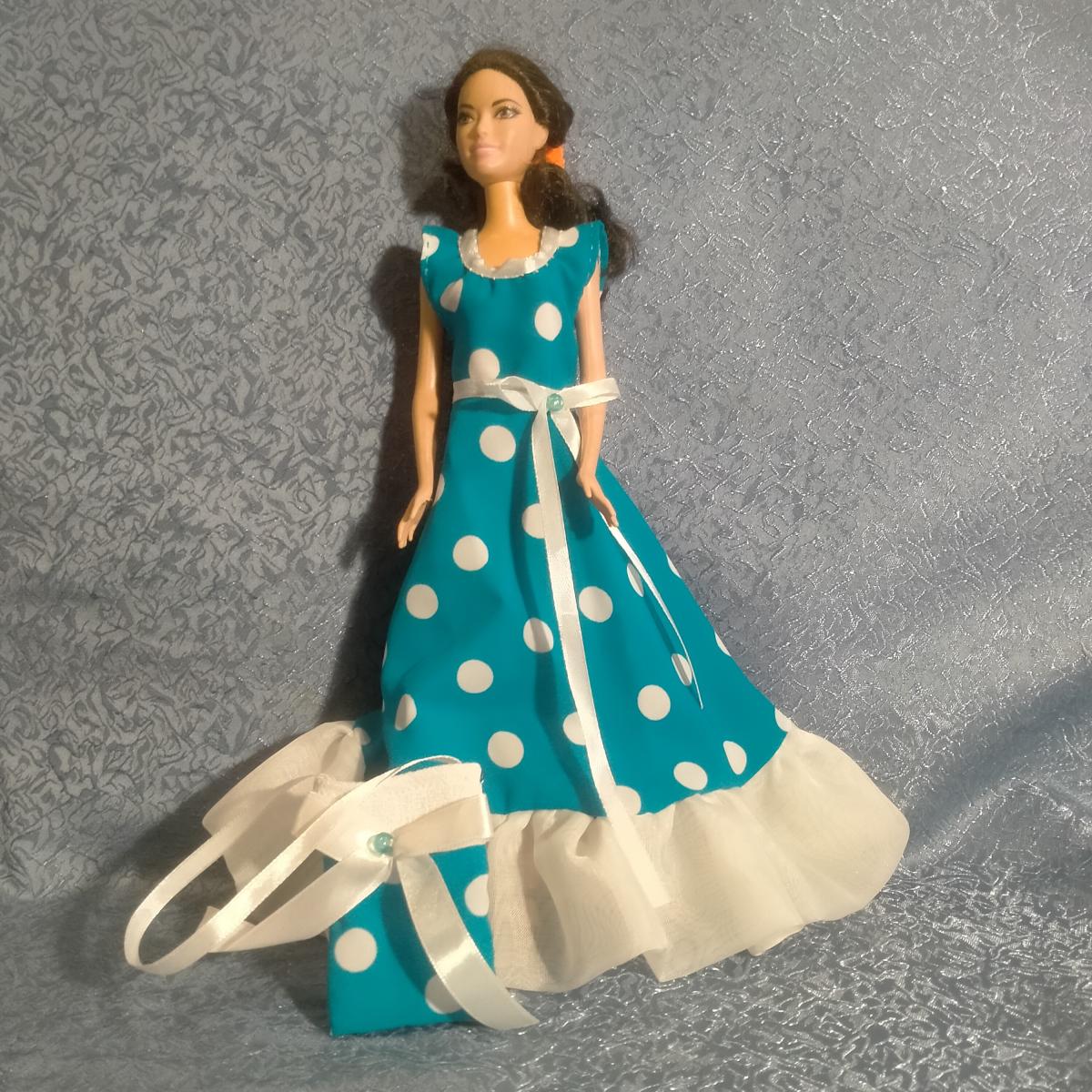 Платье для куклы Барби.Голубое в белый горох с воланом, лиф украшен атласной лентой. Застегивается на  кнопки (пришивные). Продается вместе с сумочкой.