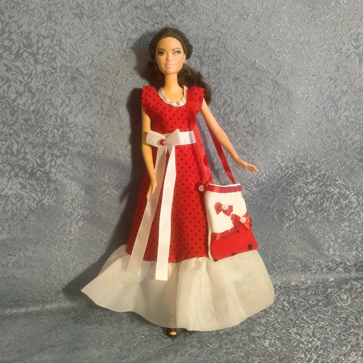 Платье для куклы Барби. Красное в мелкий черный горошек с белым воланом, лиф украшен атласной лентой. Продается вместе с сумочкой. Застегивается на  кнопки (пришивные). Для игры детям любого возраста (делям, которые могут отгрызть мелкие детали не рекомендую). Платье сшито достаточно свободно - подойдет для любой Барби. Одежды для кукол много, заходите на мою страничку. При покупке от 3 нарядов подарок (на мое усмотрение). ВНИМАНИЕ - кукла не продается!