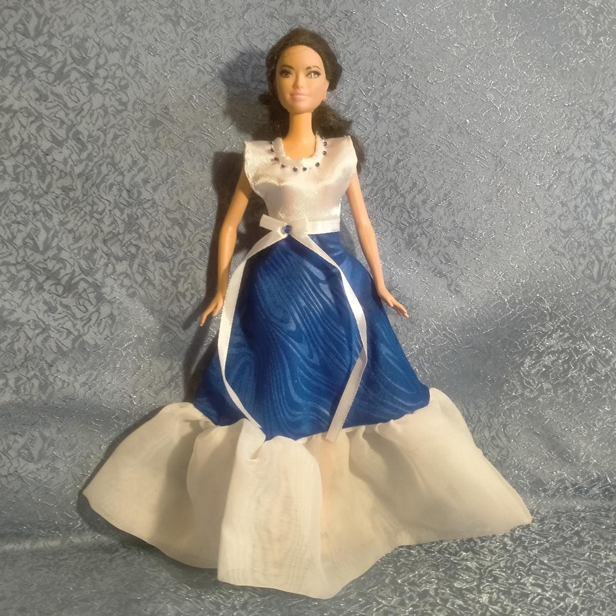 Платье для куклы Барби. Сине - белое, лиф украшен атласной лентой. Застегивается на кнопки (пришивные). Для игры детям любого возраста (делям, которые могут отгрызть мелкие детали не рекомендую). Платье сшито достаточно свободно - подойдет для любой Барби. Одежды для кукол много, заходите на мою страничку. При покупке от 3 нарядов подарок (на мое усмотрение). ВНИМАНИЕ - кукла не продается!