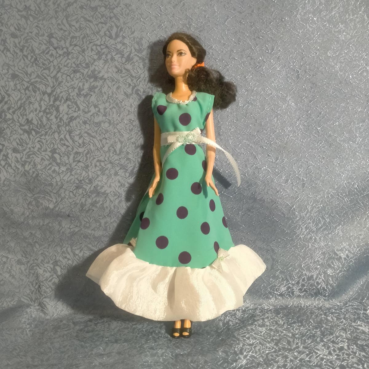 Платье для куклы Барби. Зеленое в черный горох с воланом, шелк, лиф украшен атласной лентой. Застегивается на кнопки (пришивные). Для игры детям любого возраста (делям, которые могут отгрызть мелкие детали не рекомендую). Платье сшито достаточно свободно - подойдет для любой Барби. Одежды для кукол много, заходите на мою страничку. При покупке от 3 нарядов подарок (на мое усмотрение). ВНИМАНИЕ - кукла не продается!