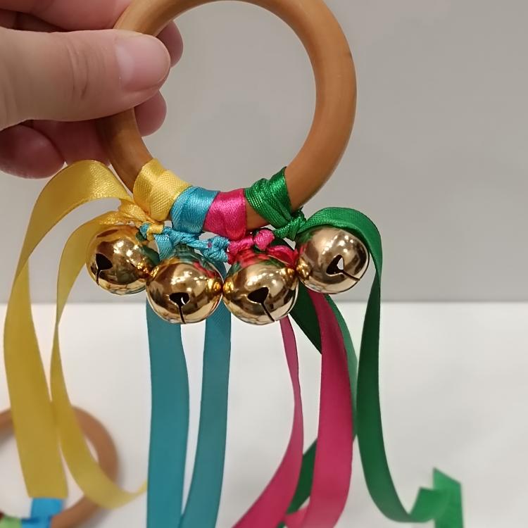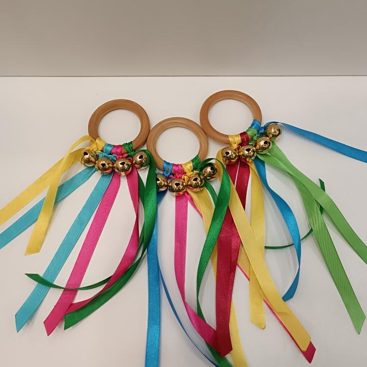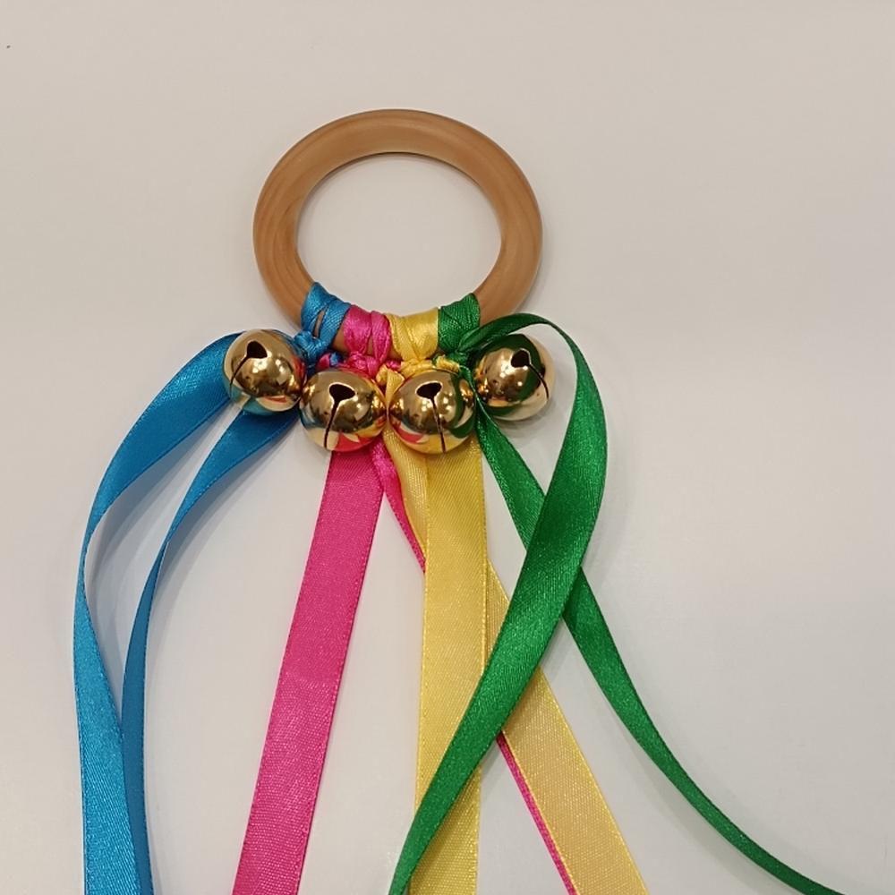 Изделие представляет собой деревянное кольцо диаметром 7см, на которое навязаны разноцветные атласные ленты шириной 1,5см. Длина свободных концов ленточек составляет 20-25см. Также на каждую ленту к кольцу прикреплен бубенчик диаметром 1,5см. Он надежно привязан и закреплен, что исключает отвязывание или отрывание. Концы лент оплавлены, чтобы не распускались. Колечко обработано специальным маслом для игрушек на основе льняного.
