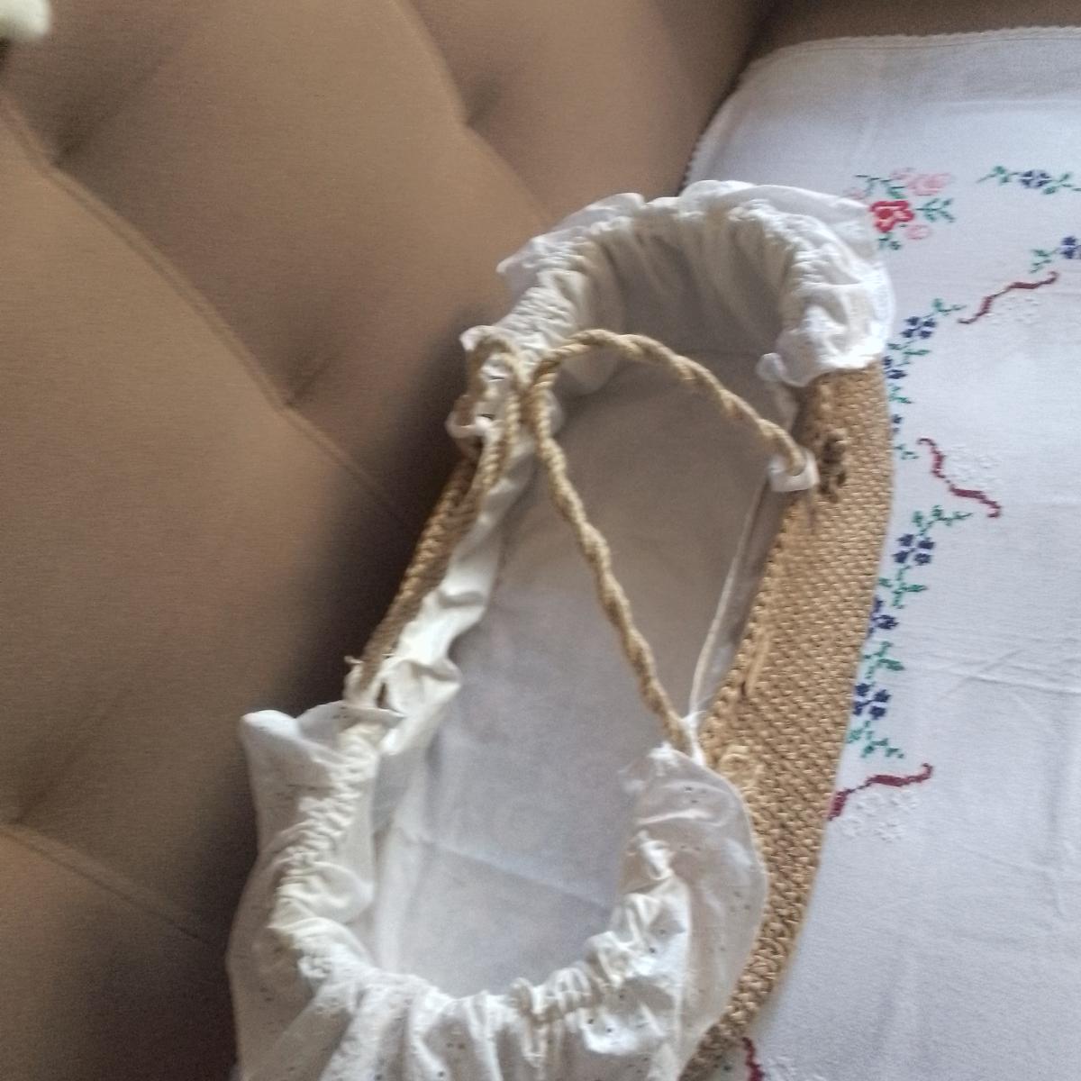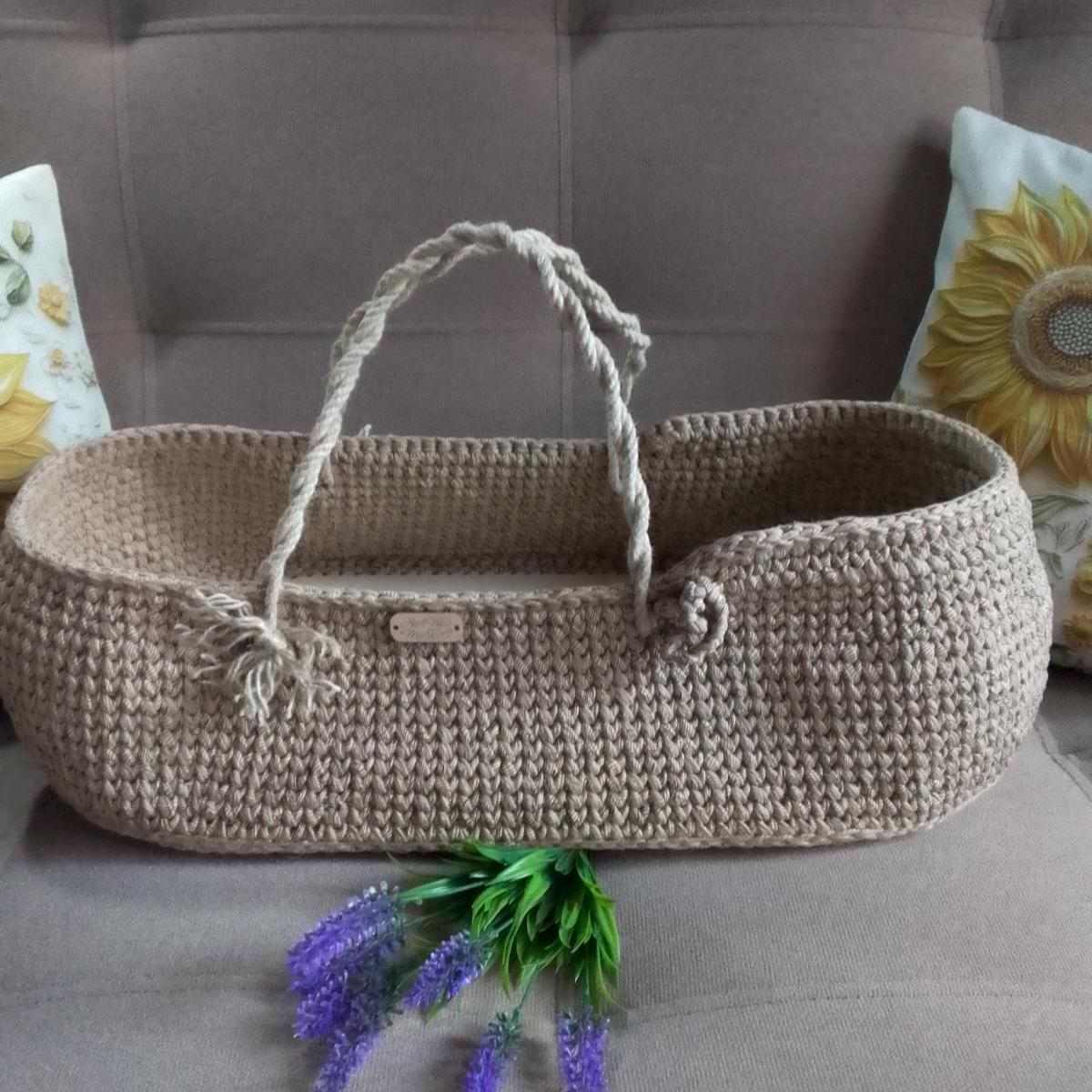 Люлька переноска для младенца вязанная крючком, ручной работы ,цвет бежевый из полиэфирного шнура с добавлением джута донышко дерево 60/30, матрасик в подарок ,высота19 смручки прочные из джутового шнура. Ессентуки доставка бесплатная.