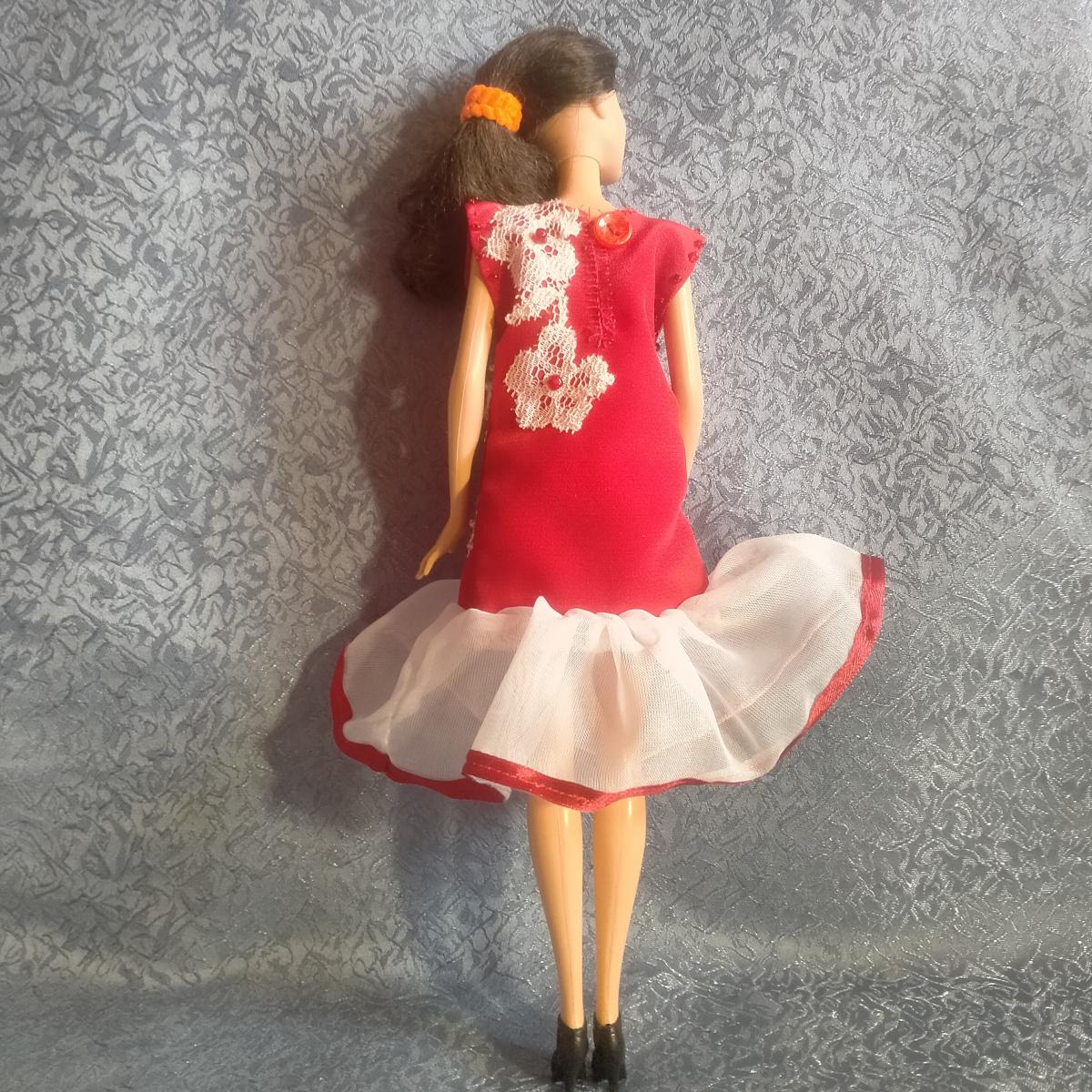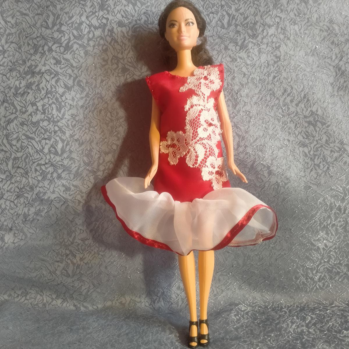 Платье для куклы Барби. Красный лиф украшен гипюром и бисером. Застегивается на пуговку. Для игры детям любого возраста (делям, которые могут отгрызть мелкие детали не рекомендую). Платье сшито достаточно свободно - подойдет для любой Барби. Все швы обработаны на оверлоке. Можно стирать, приклеенных деталей нет. Сделано в 1 экземпляре.