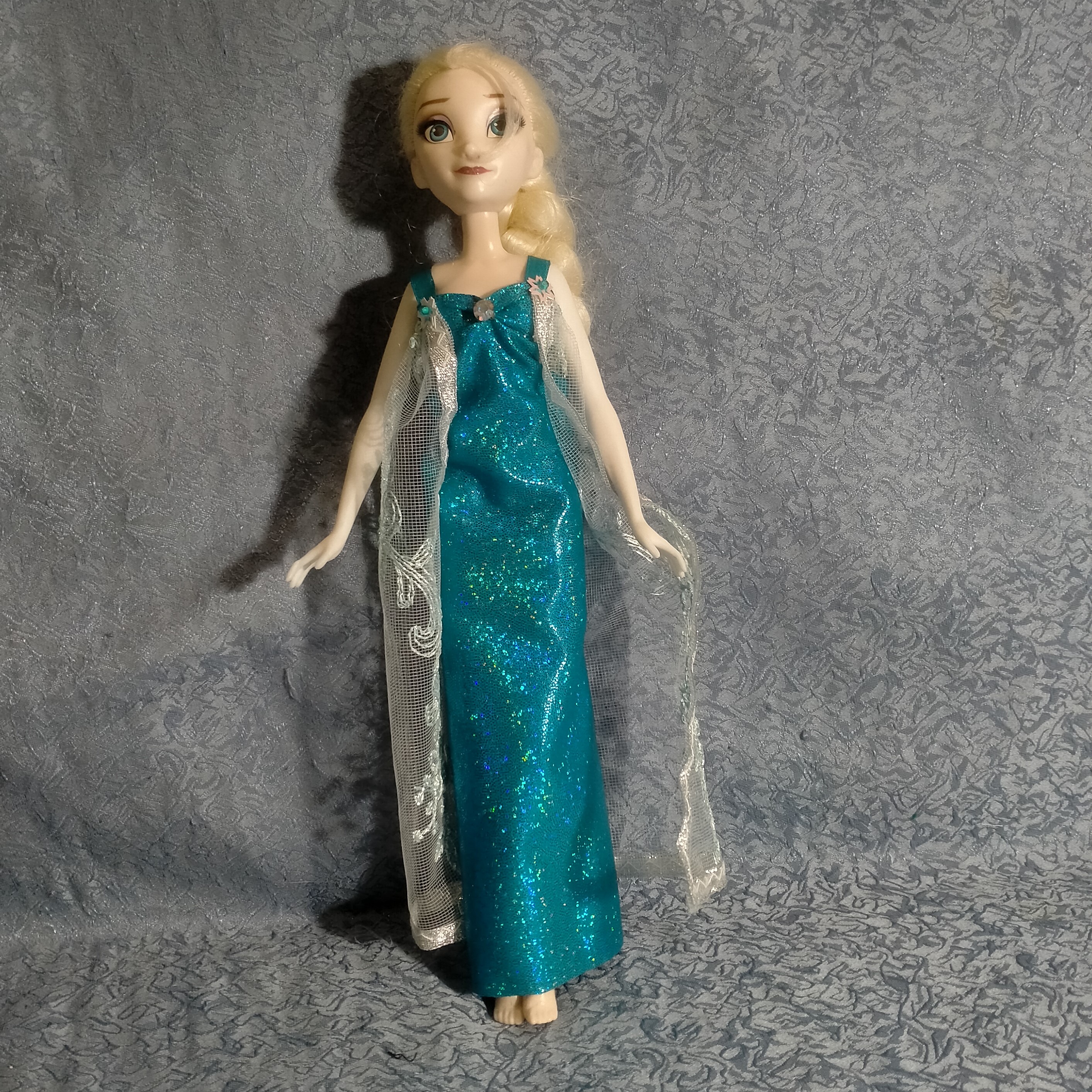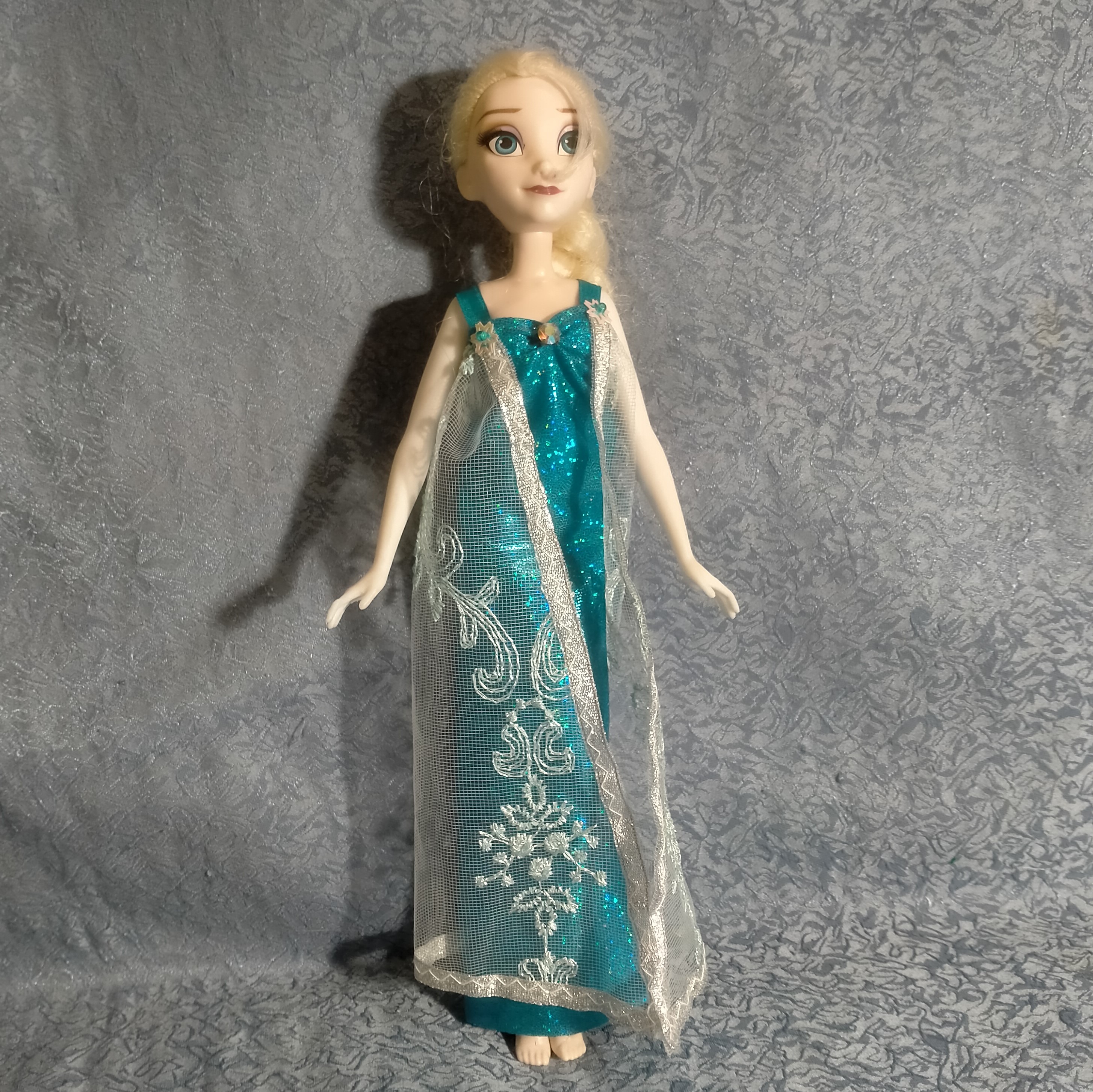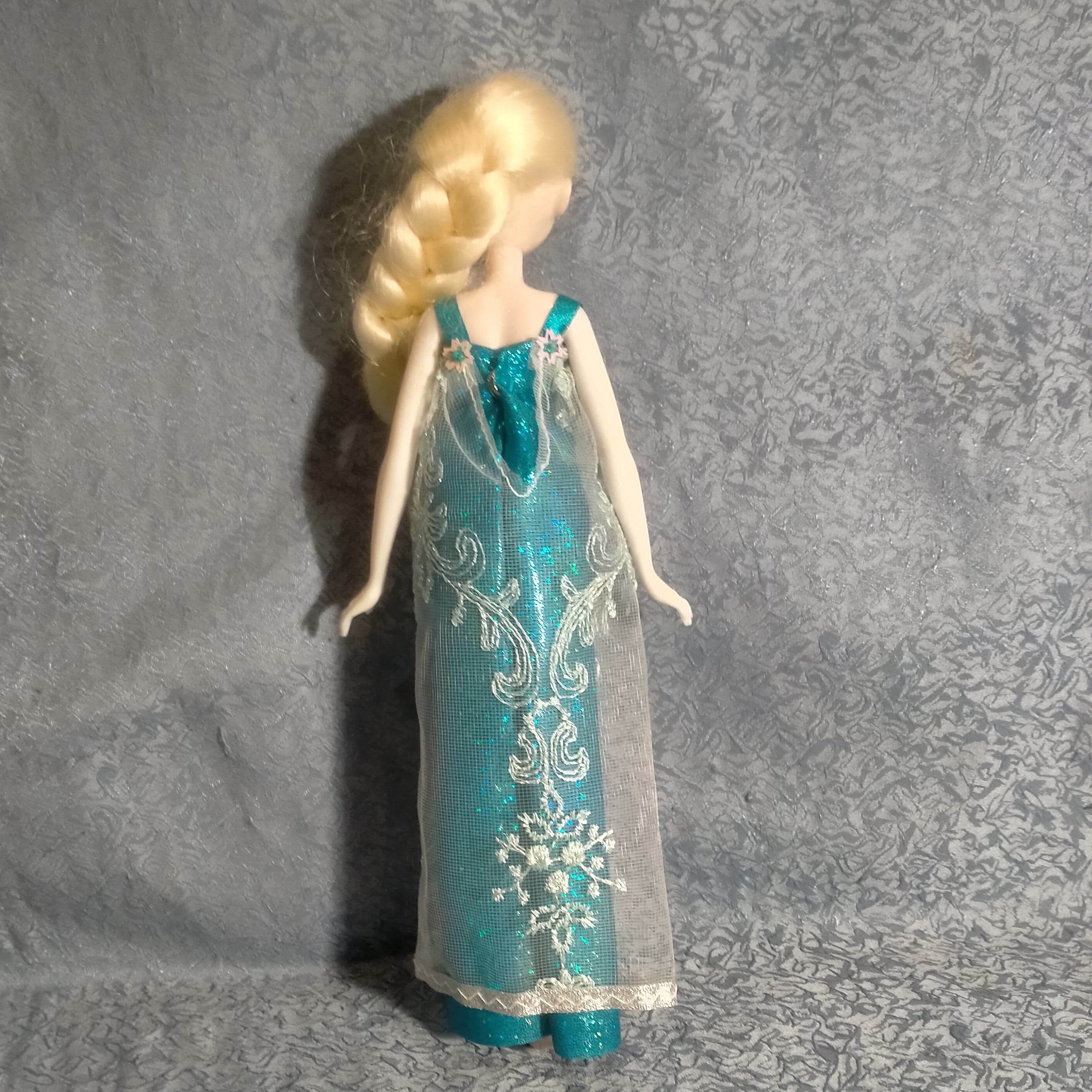 Платье для куклы Эльзы из мультфильма "Холодное сердце". Сшито из блестящий не сыпучей ткани, шлейф из гипюра. Украшено стразами. Застегивается на кнопку. Для игры детям любого возраста (делям, которые могут отгрызть мелкие детали не рекомендую).