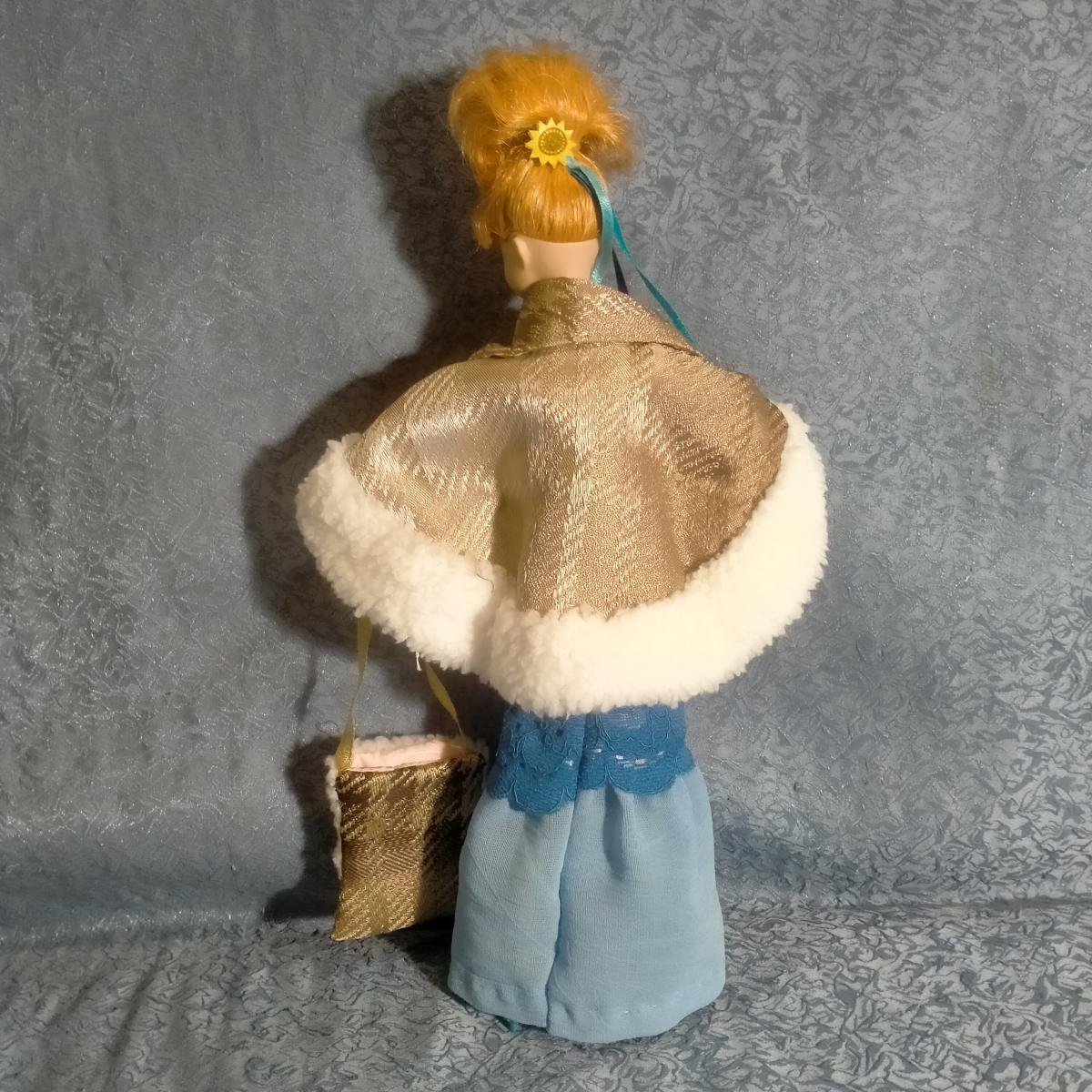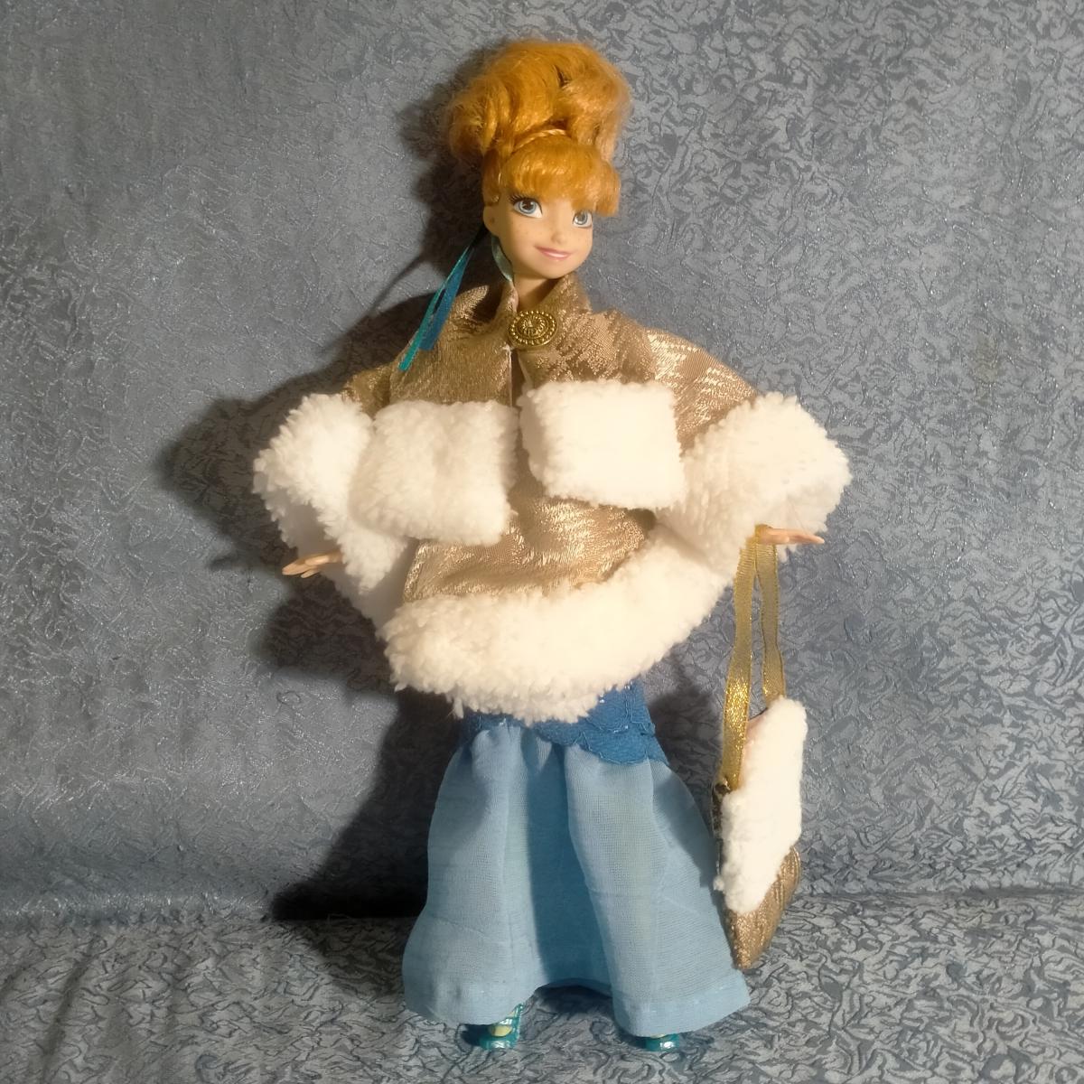 Пончо с шарфом и сумочкой для куклы Анны из мультфильма "Холодное сердце". Сшито из качественной ткани, отделка искусственный белый мех, на подкладке. Застегивается на кнопки (пришивные). Для игры детям любого возраста, мелких деталей, кроме пуговицы на шарфе нет. Сделано в различной цветовой гамме, заходите в магазин! Для Эльзы и Барби коротковаты рукава.