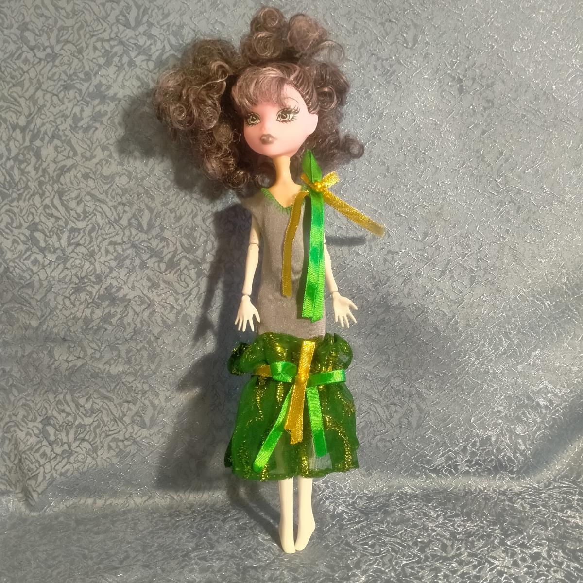 Платье для куклы Монстер Хай. Выполнено из плотного серого трикотажа, застегивается на пуговицу. Волан из розовой зарой ткани украшен бантом и подвеской с сердечком. Для игры детям любого возраста (делям, которые могут отгрызть мелкие детали не рекомендую). Можно стирать, приклеенных деталей нет. В связи с тем, что тело многих куколок очень похоже, подходит и высоким и маленьким куклам.