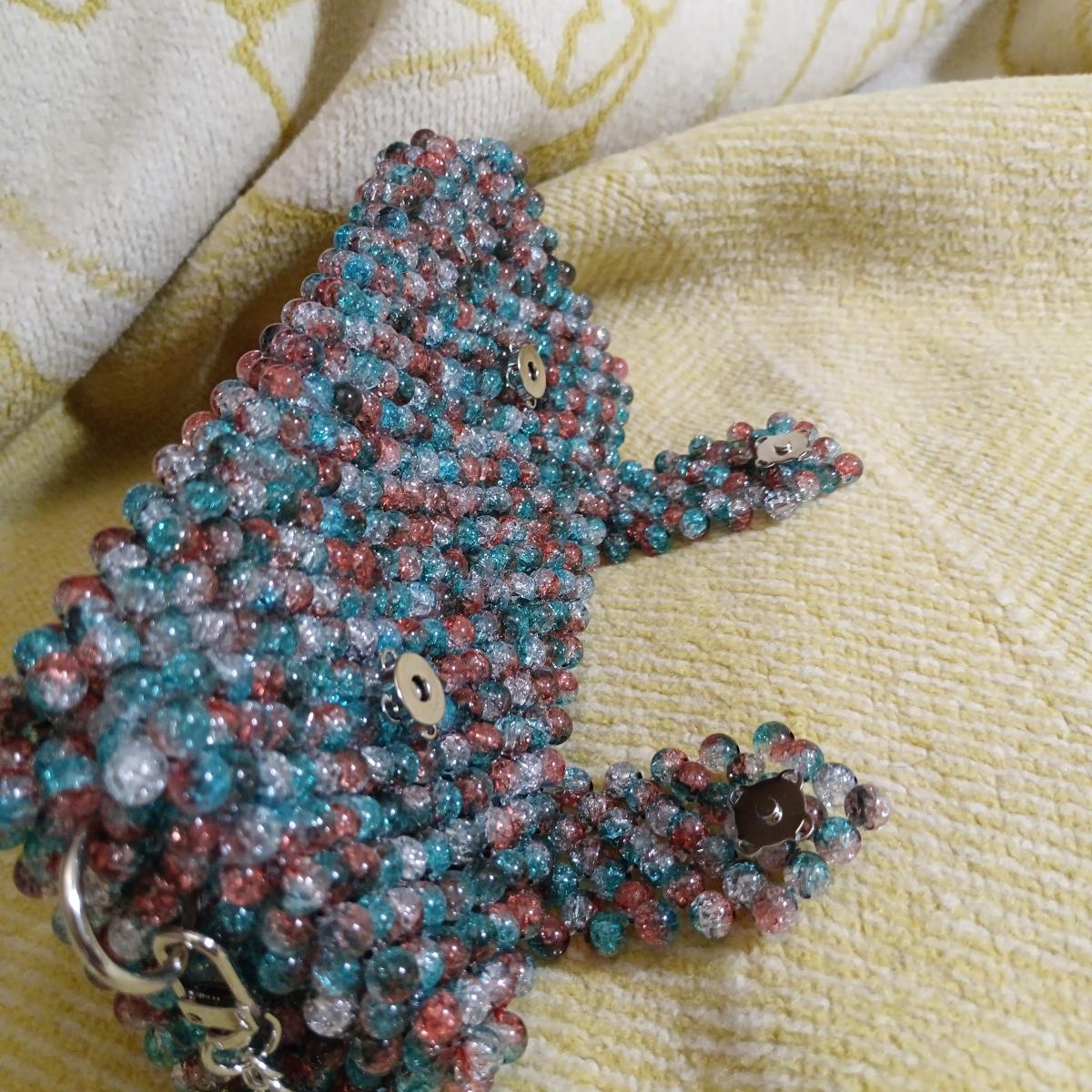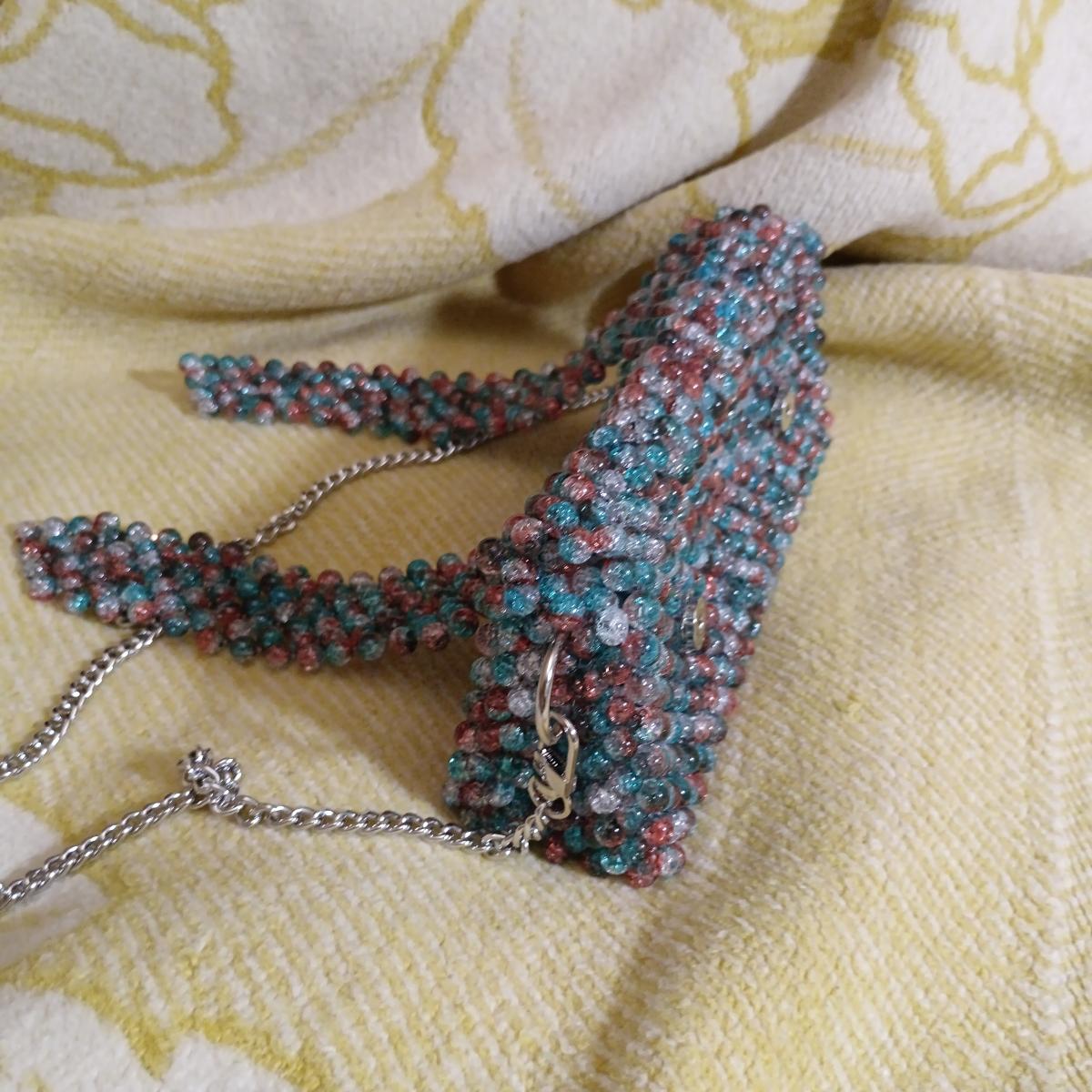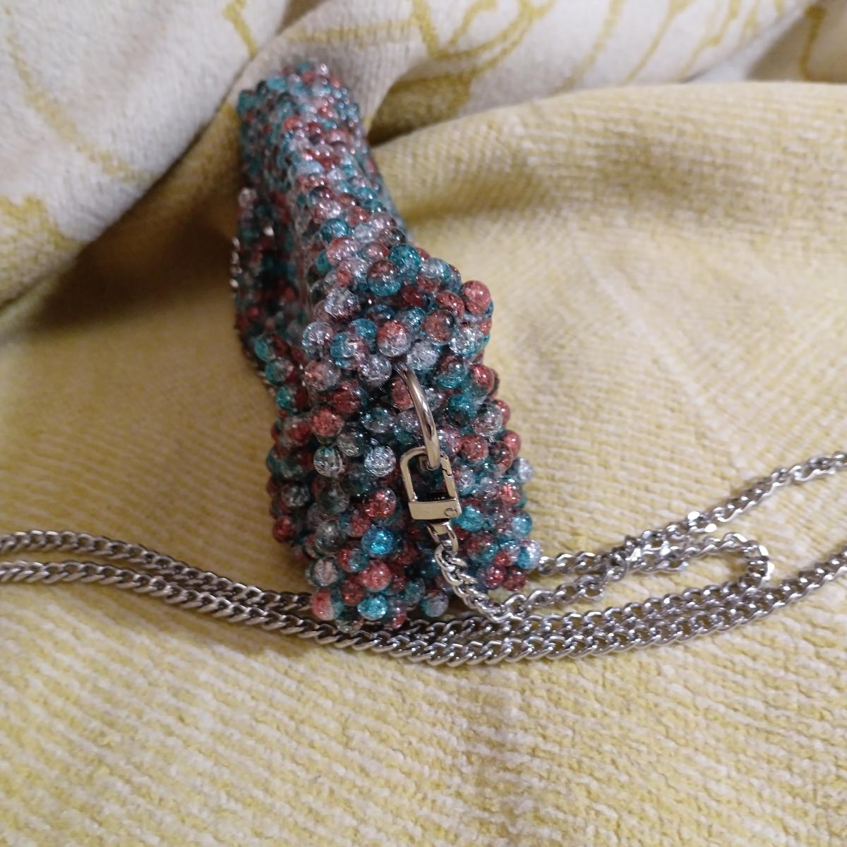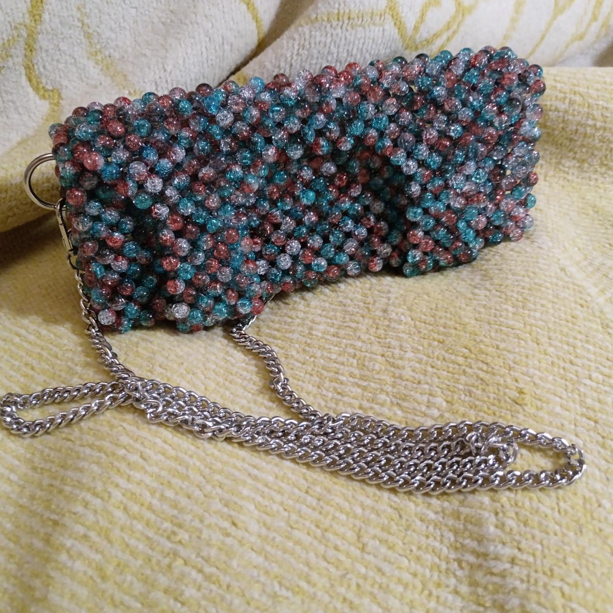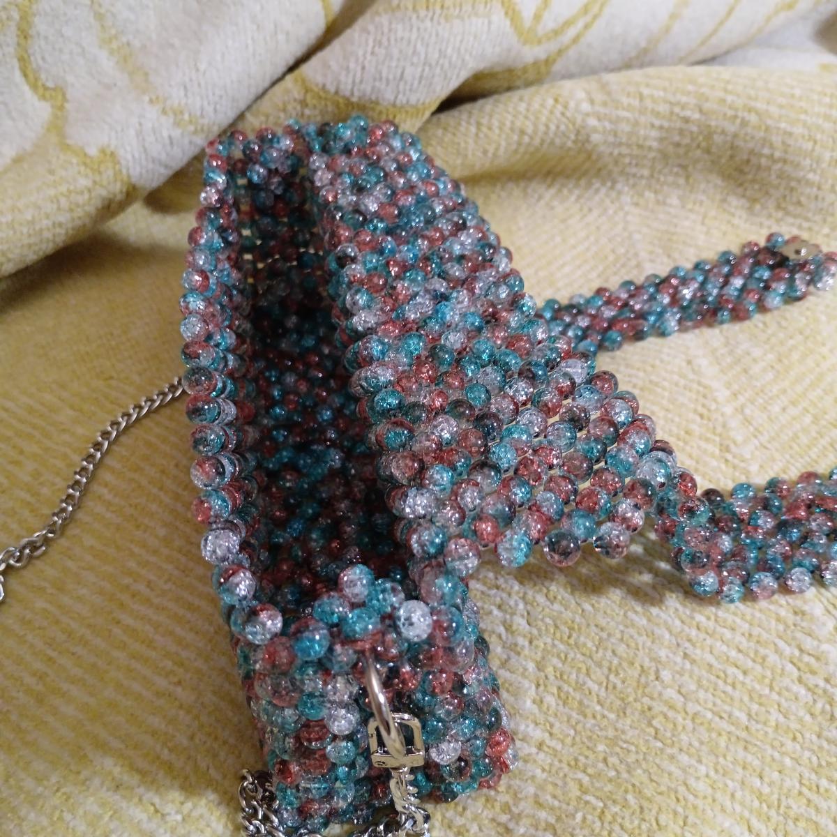 Бирюзово-апельсиновые акриловые бусины с эффектом разбитого стекла сияет на солнышке - глаз не оторвать. Идеально для отпуска, чтобы освободить руки от телефона и кошелька.