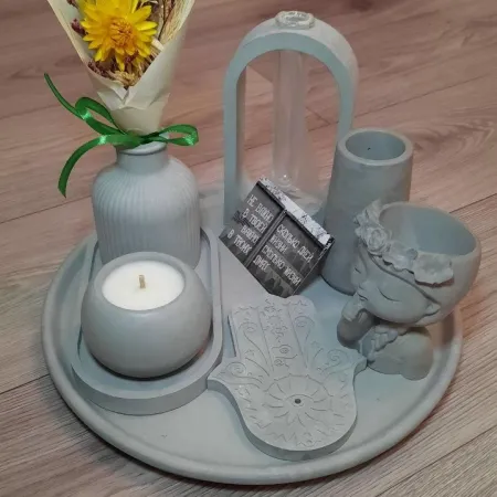В состав комплекта входит: большая, круглая подставка под всякую мелочь, маленькая подставка, кашпо, 2 вазы под деффузор или сухоцветы, ваза с колбой под срезанный цветок, подсвечник многоразовый, подставка под благовония, букет с сухоцветами, открытка, инструкция по уходу за гипсовыми изделиями.