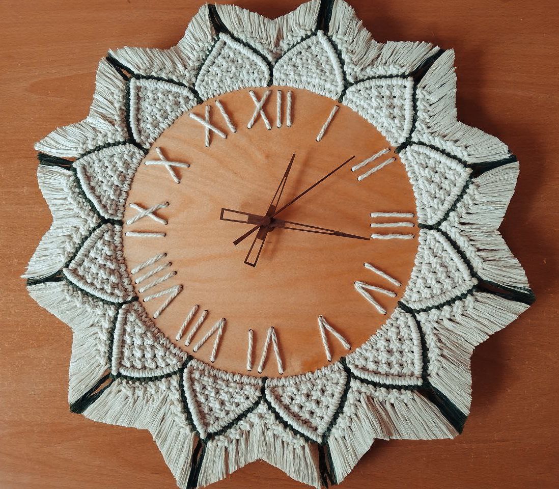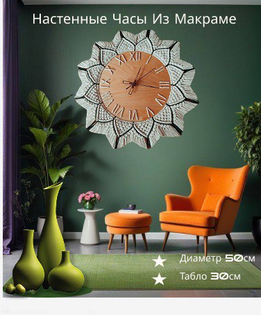 Настенные часы ручной работы в технике макраме для интерьера.Используемые материалы: 100% хлопок, дерево, механизм бесшумный. Размеры: диаметр циферблата 30 см, общий диаметр 50 см, вес 0,58 кг.