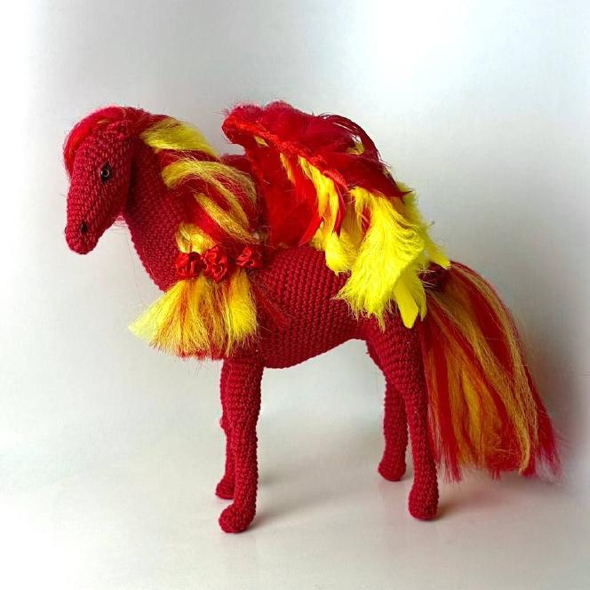Вязаная декоративная фигурка  мягкой игрушки в образе лошади с огненными элементами — гривой и хвостом, стилизованными под пламя. Материал гривы и хвоста-канекалон, украшенные розочками из атласа.