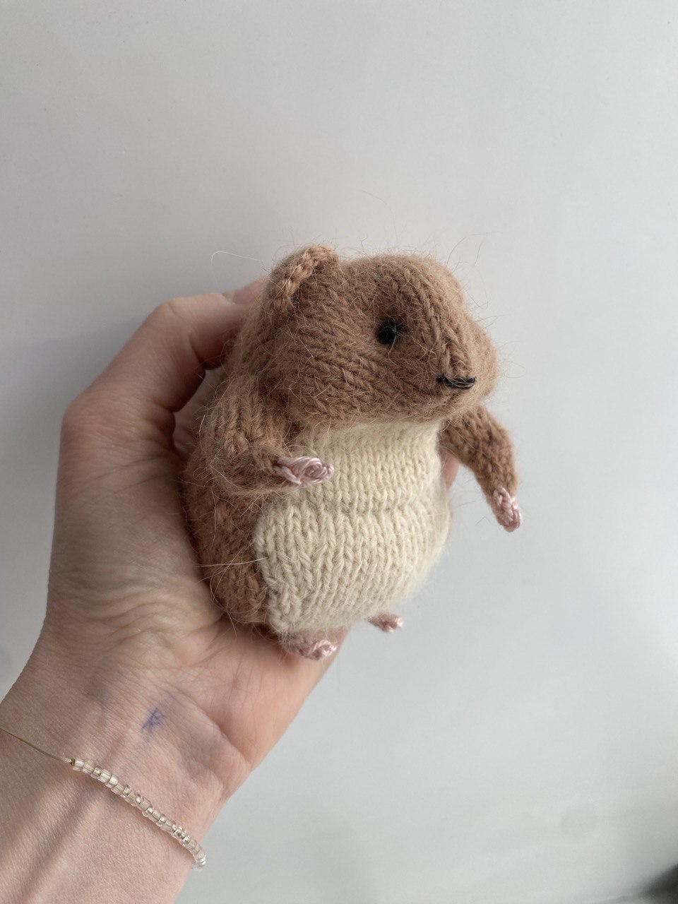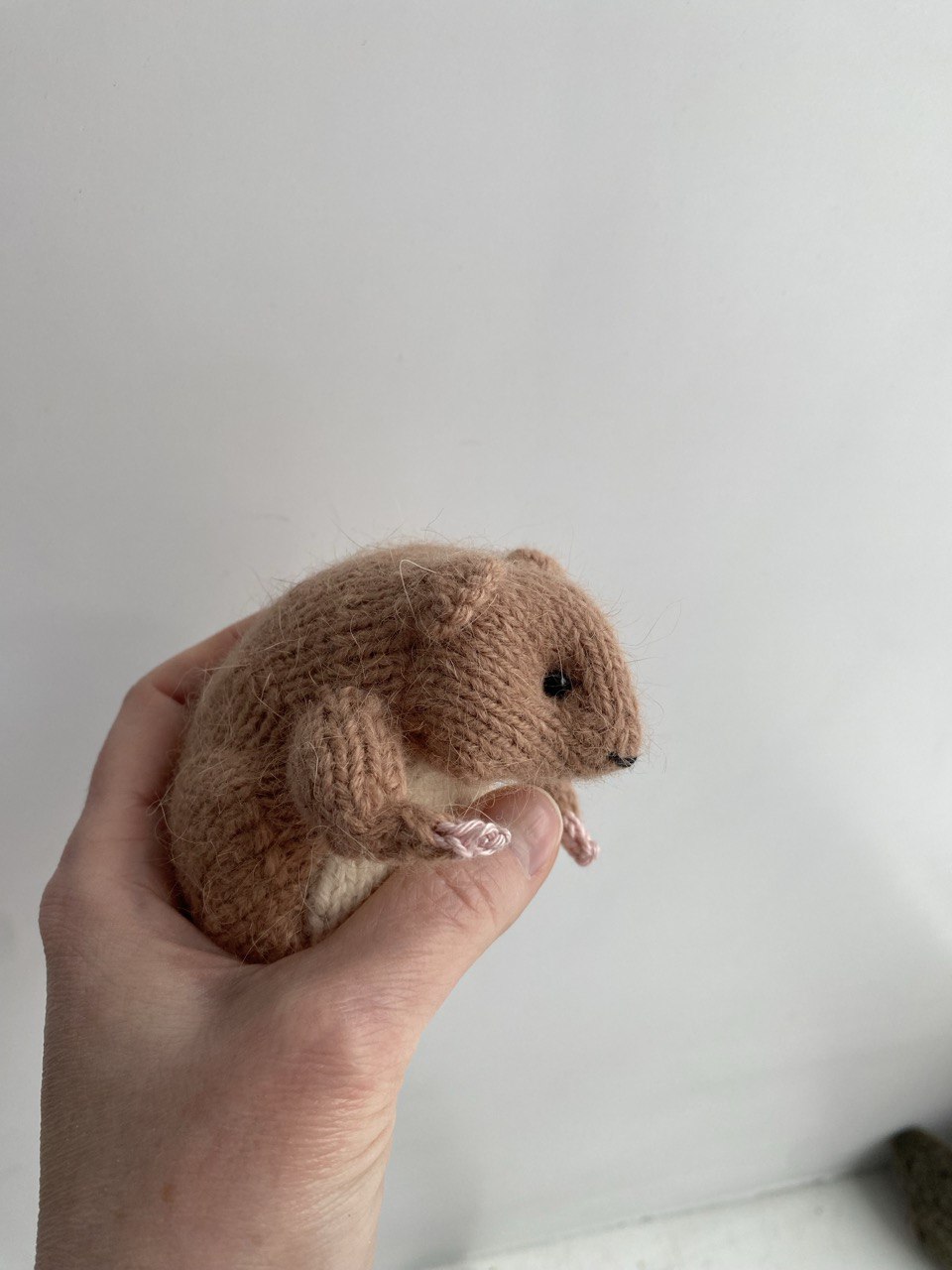 Познакомьтесь с этим очаровательным зверьком! Этот трогательный хомяк связан вручную из нежнейшего мохера, что делает его невероятно мягким и приятным на ощупь. Пушистая текстура пряжи идеально передает уютный образ маленького грызуна.
