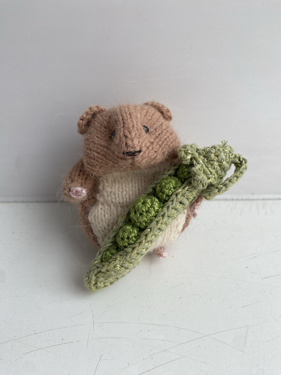 В лапках хомяк держит свой любимый стручок зеленого горошка, связанный из хлопка. Этот аксессуар съемный и добавляет игрушке особого шарма.