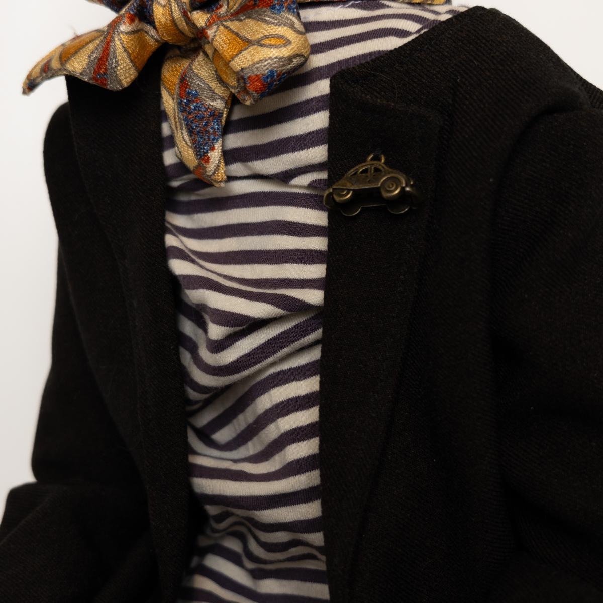 Материалы: полимерный LivingDoll, текстильное тело на шплинтах и дисках, шарнирная голова, авторская роспись. Одежда: текстиль, кожа, фурнитура. Размер: 65 см.