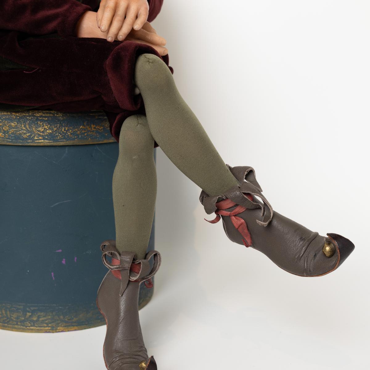 Материалы: полимерный LivingDoll, текстильное тело на шплинтах и дисках, шарнирная голова, авторская роспись. Одежда: бархат, шелк, кожа, фурнитура. Размер: 65 см.