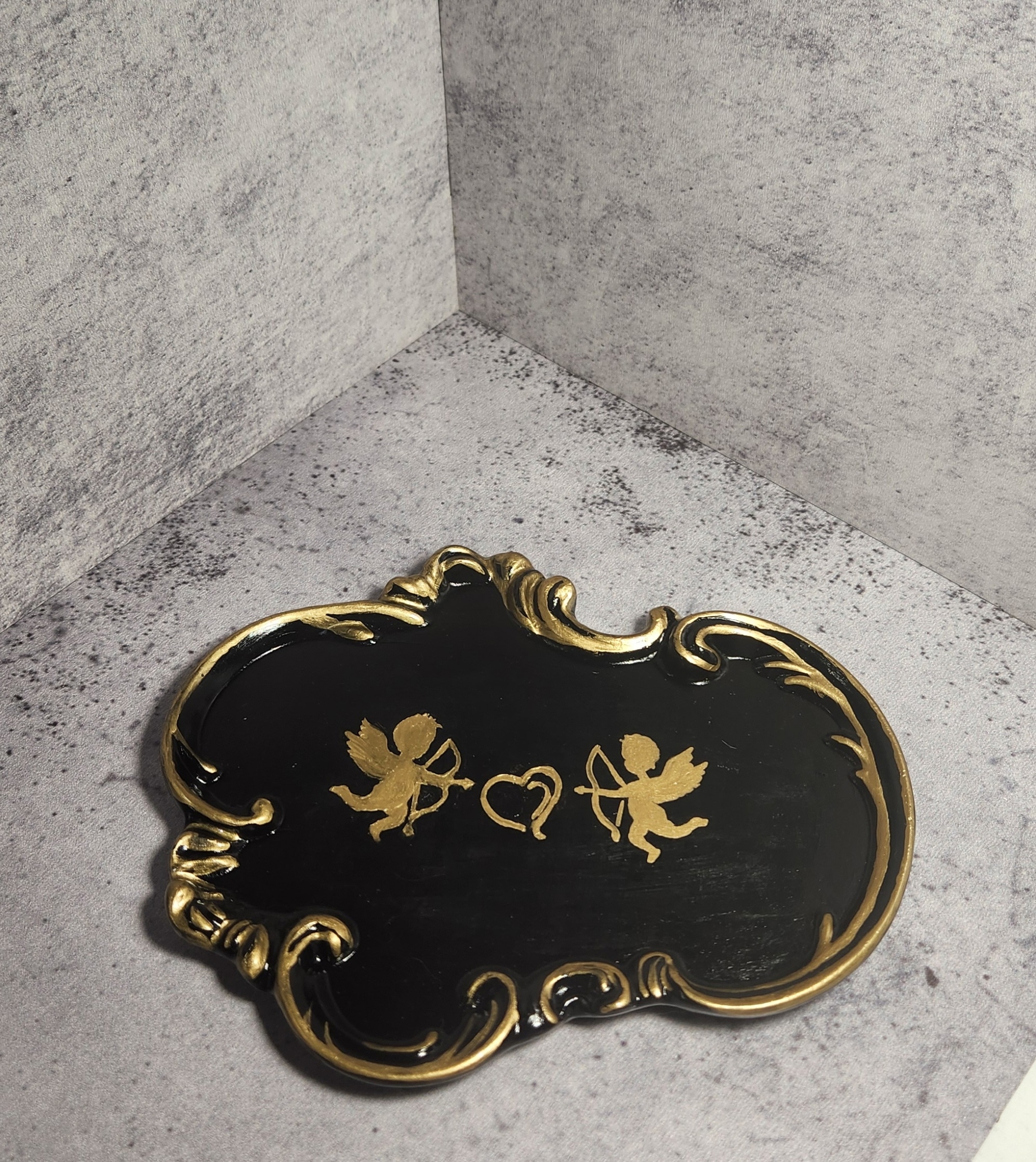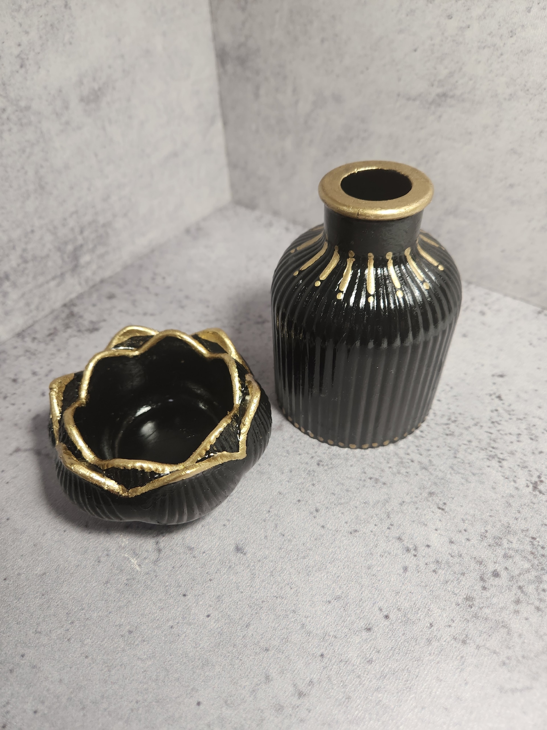 Этот набор создан вручную — от первого мазка до финального штриха. Глубокий чёрный цвет служит фоном для изящного золотого узора, нанесённого вручную кистью. Ни одна линия не повторяется полностью.
