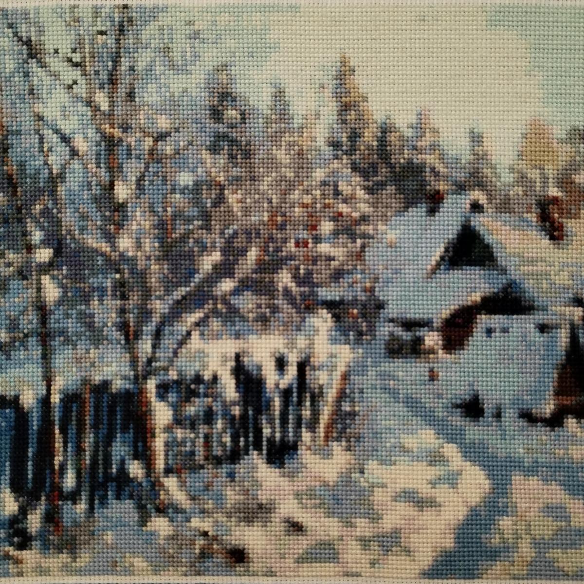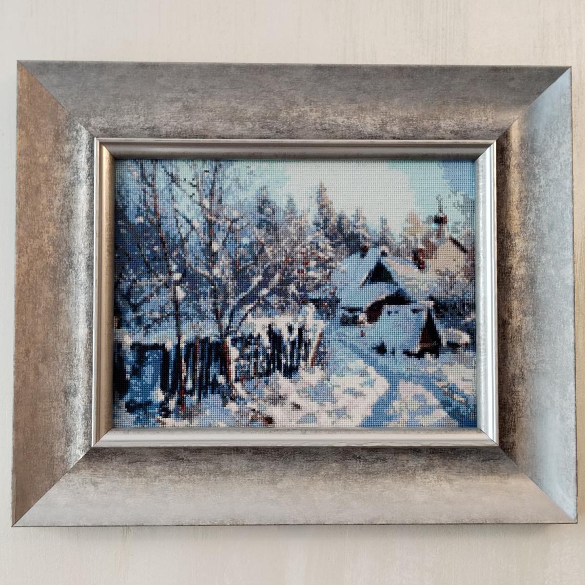 Вышивка натянута на подрамник, оформлена в деревянный багет, антибликовое (музейное) стекло.