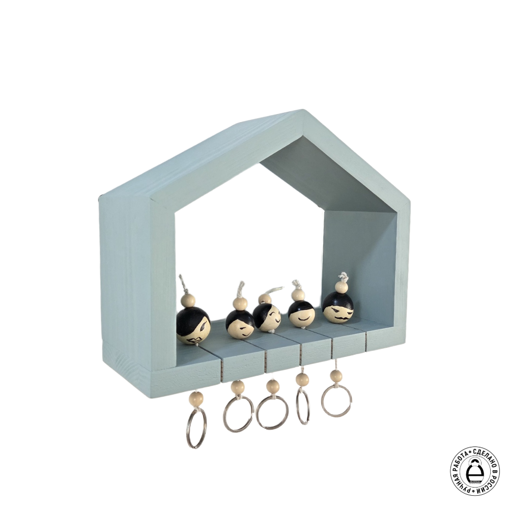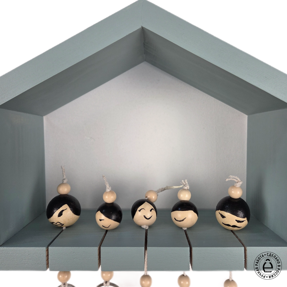 Набор выполнен в виде семейства из пяти деревянных фигурок: взрослый мужчина, женщина и трое детишек. Брелоки удобно крепятся в держателе-ключнице, символизирующей семейное единство и благополучие. Сама ключница размещается на вертикальной поверхности. Этот комплект станет отличным решением для хранения ключей, украшением прихожей и напоминанием о важности семейных ценностей.