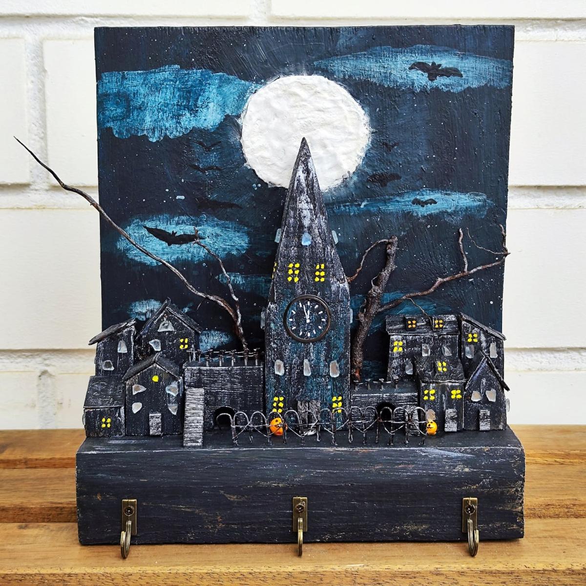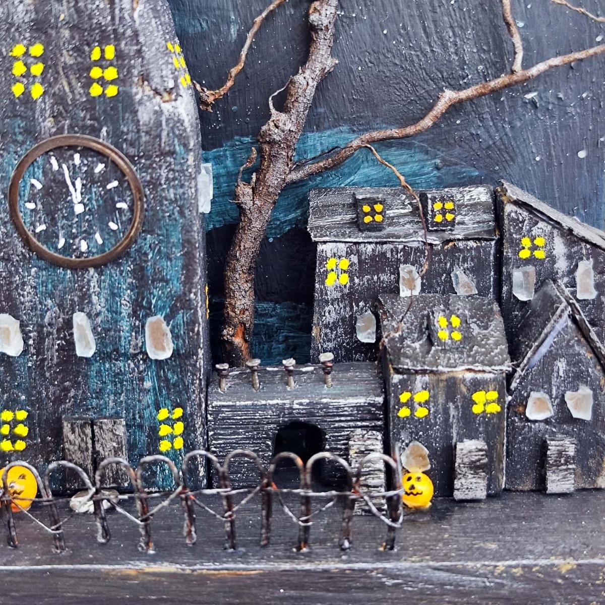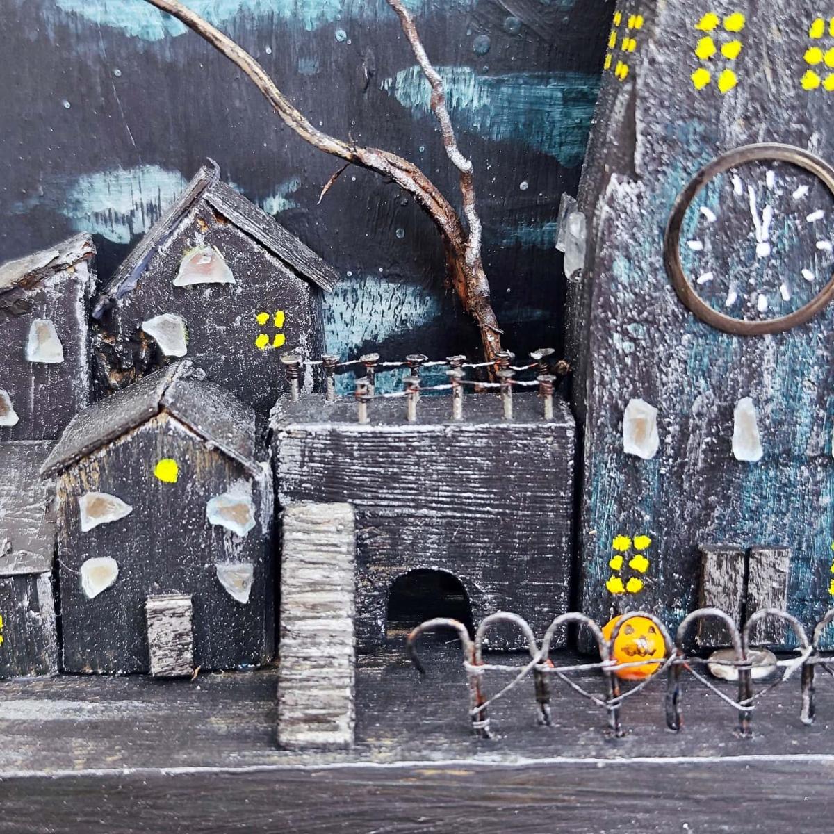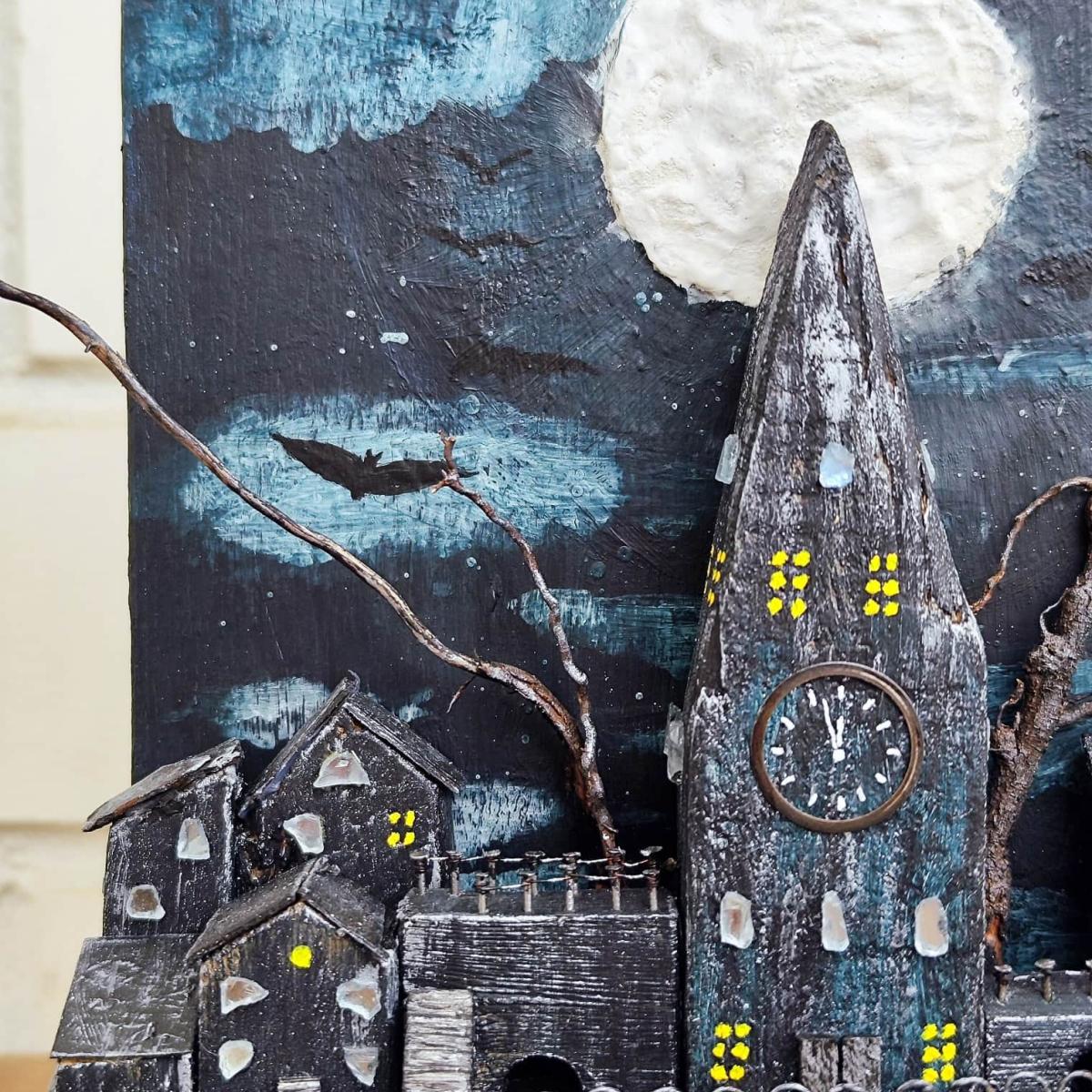 Ночной город на Хэллоуин в стиле дрифтвуд. Свет Луны, сделанной в объеме, отражается в фальшивых зеркалах окон. Местами горит свет. Черный замок, окруженный кованым забором, встречает гостей...