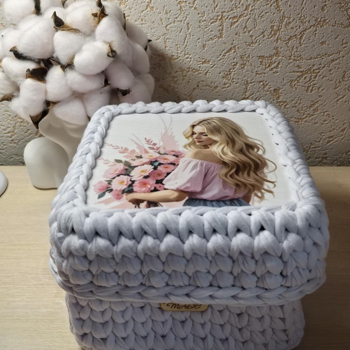 Корзинка для хранения мелочей. С деревянным дном. Размер донышка 15х15см. Состав пряжи полиэфир+ эластан. Цвет белый. Высота корзинки 10,5см. Вместе с крышкой - 11,5см. Подойдёт для хранения украшений, косметики, ключей, заколочек, бижутерии и прочих мелочей. А также может просто стать украшением Вашего интерьера.
