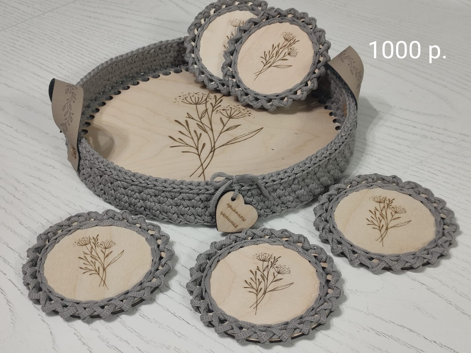 Изготовлен из полиэфирного шнура, основа деревянная, ручки из кожи.