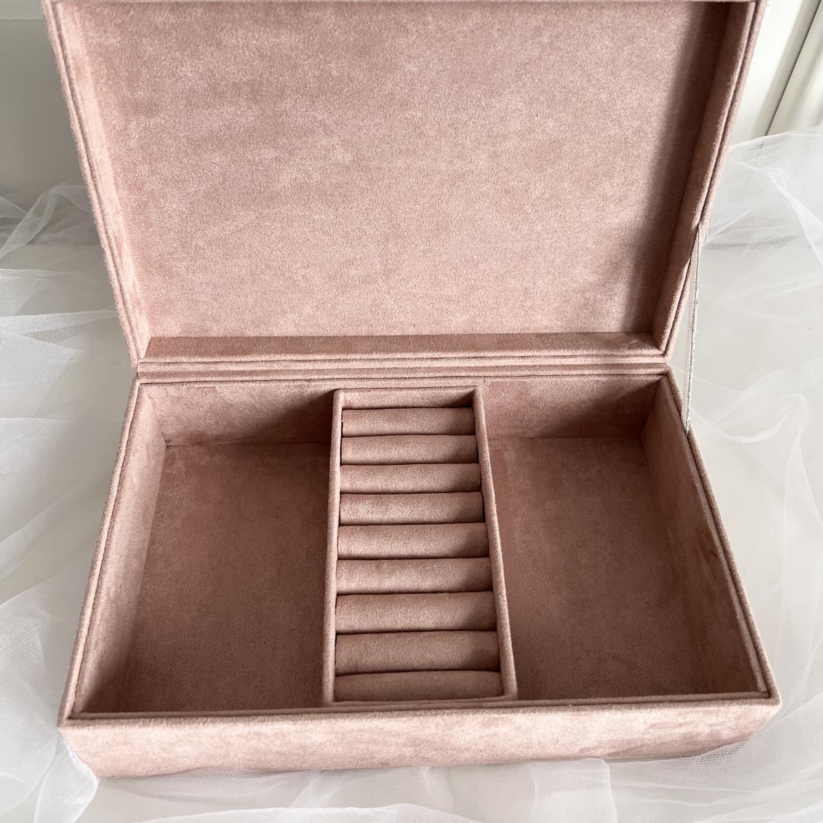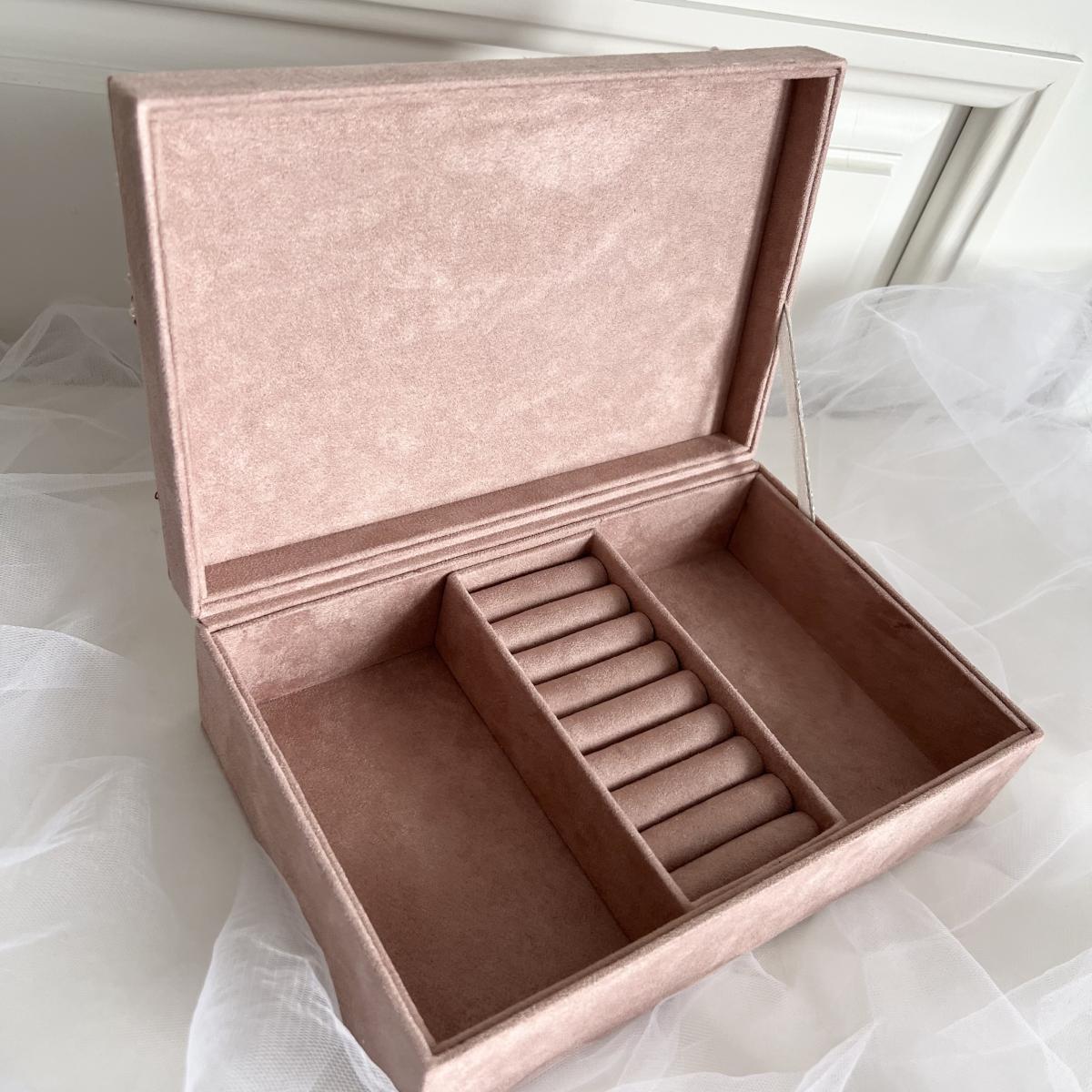 Внутри, шкатулка полностью отделана замшей в розовом цвете, с тремя отделениями. Среднее отделение для колец и сережек.