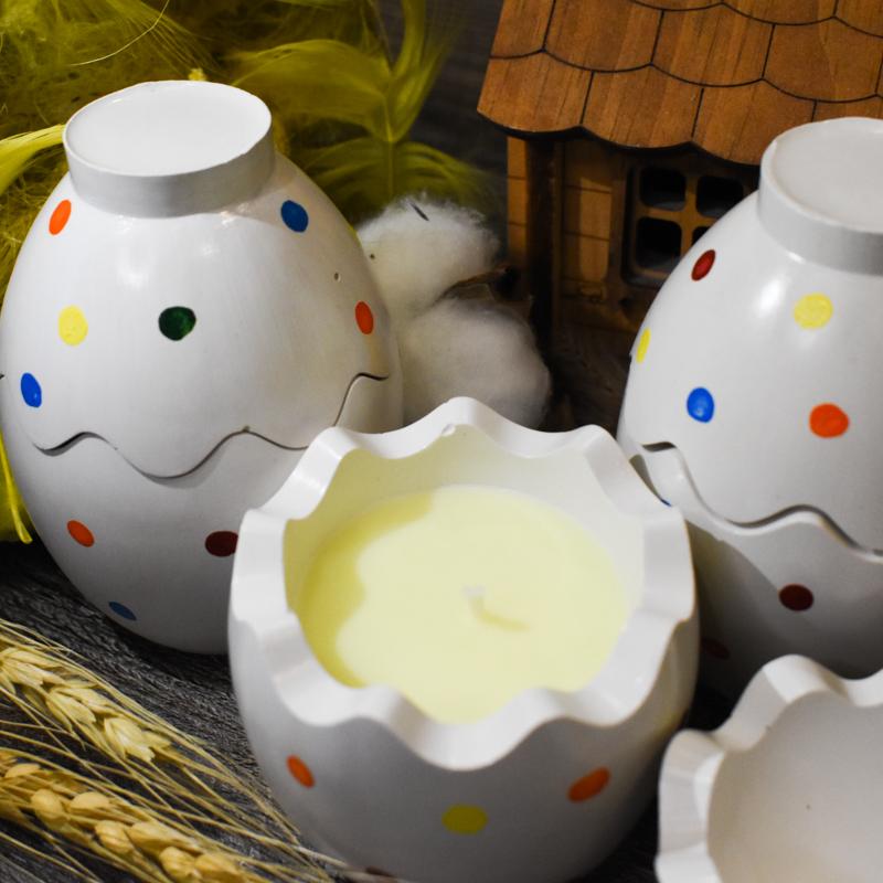 Внутри свеча представлена в трех различных расцветках, что делает ее более нарядной, а веселый горошек напомнит о шутках и веселье. И, конечно, о том самом пасхальном зайчике.