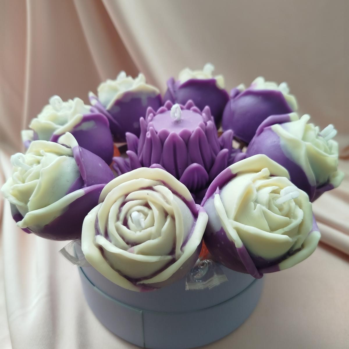 Букет в шляпной коробке - розы 8 шт (4*4,5 см каждая свеча) + 1 лилия (6*5см)