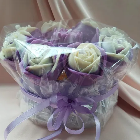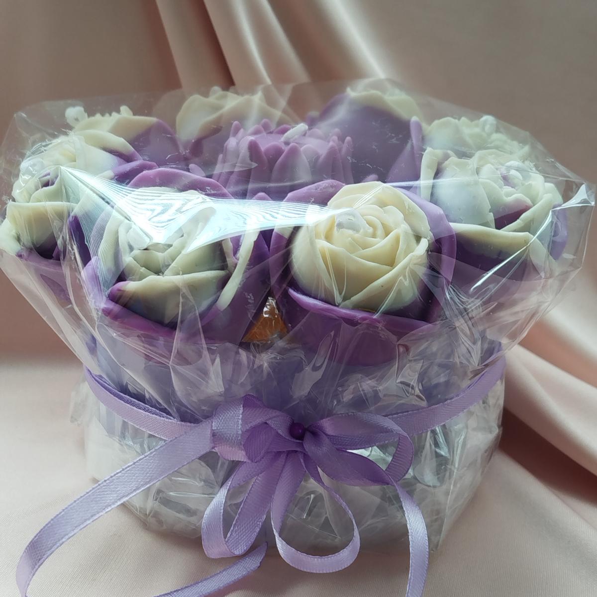 Бело-сиреневые розы, загадочная лилия, мягкий свет свечей и тонкий цветочный аромат уместились в одной элегантной коробке.