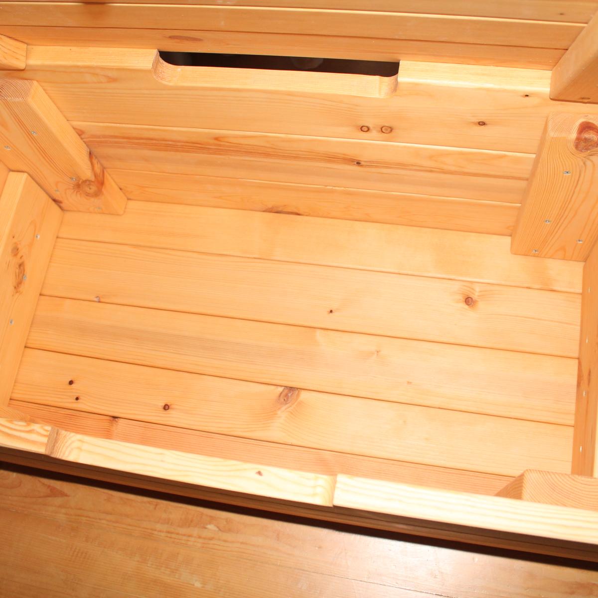 Сундук на дачу под навес на террасу или в беседку. Желательно для улицы, так как если его поставить к горячей батарее, то теоретически в некоторых местах может появляться смола.