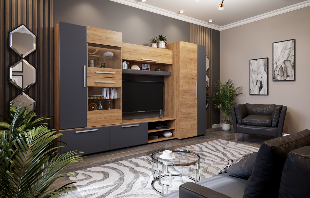 Стенка «Сафари» выполнена в современном выдержанном европейском стиле. Лучше всего эта стенка будет смотреться в интерьере просторной светлой гостиной.