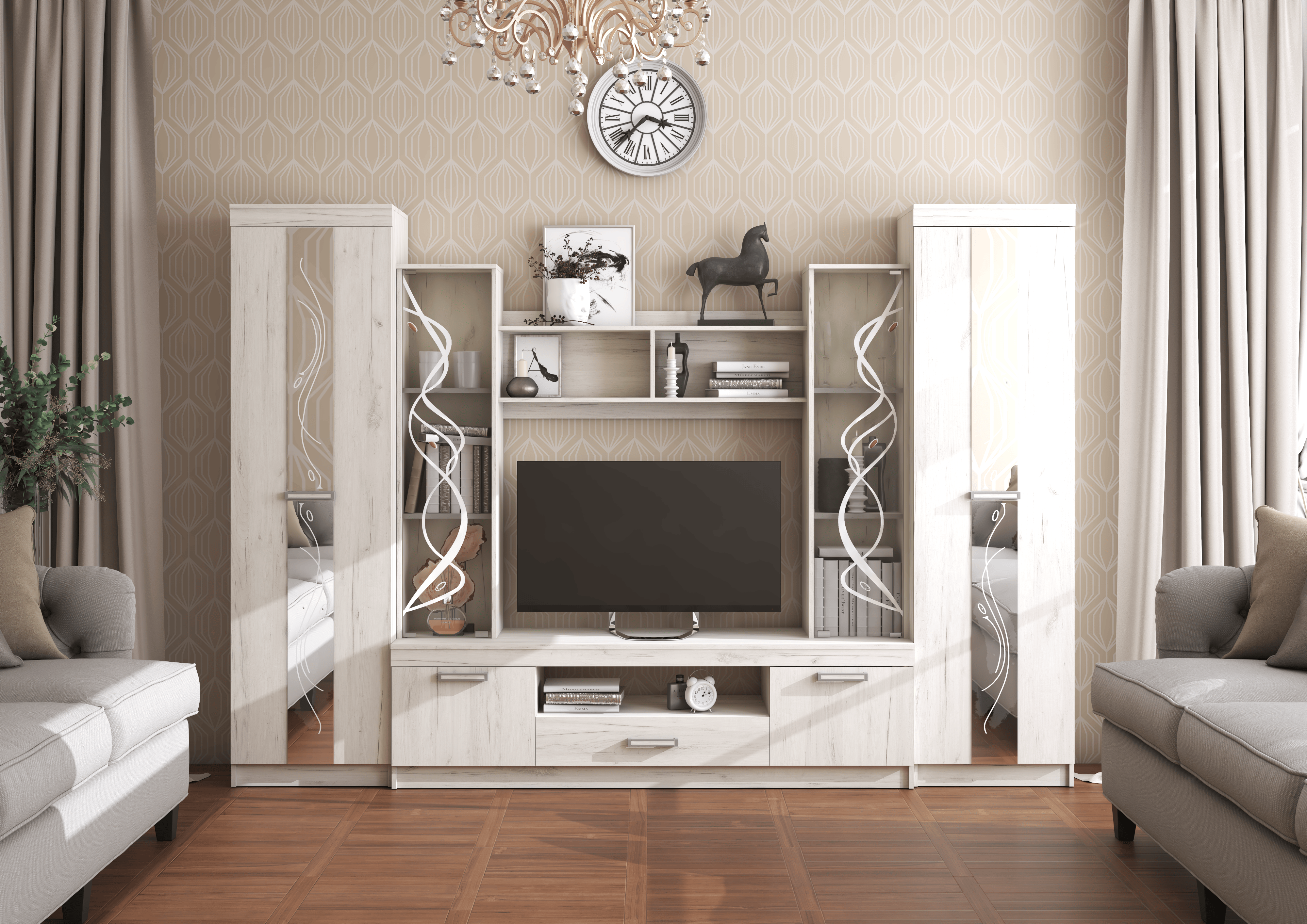 Выполненная в строгом классическом стиле стенка «Атлантида-2Б» - пример удачного совмещения элегантного дизайна и функциональности. «Атлантида» станет отличным дополнением для просторной светлой гостиной.