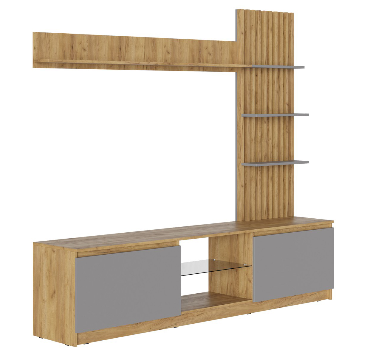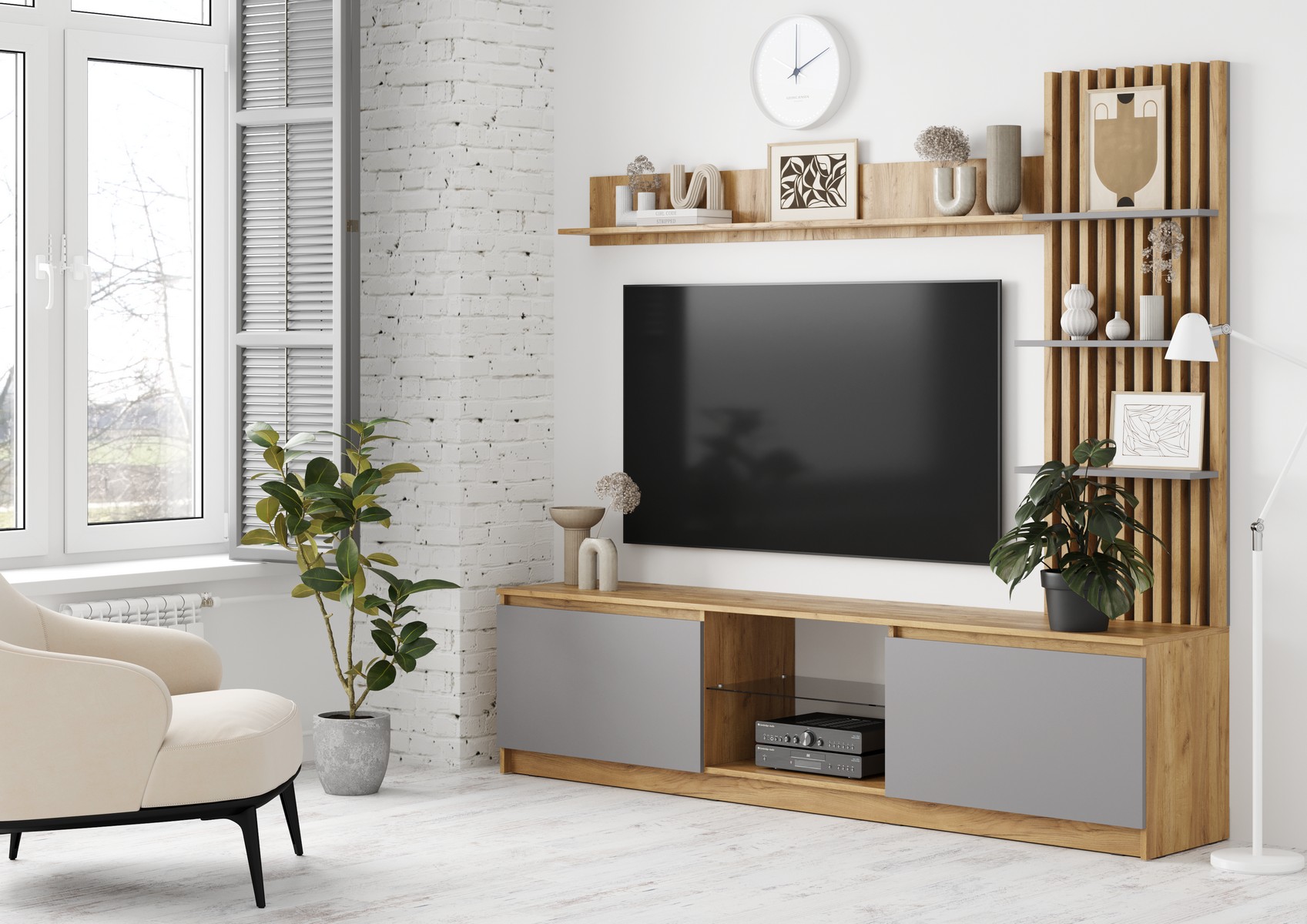 •    Ниша под телевизором оборудована стеклополкой из тонированного стекла в цвете Графит, края обработаны еврокромкой
